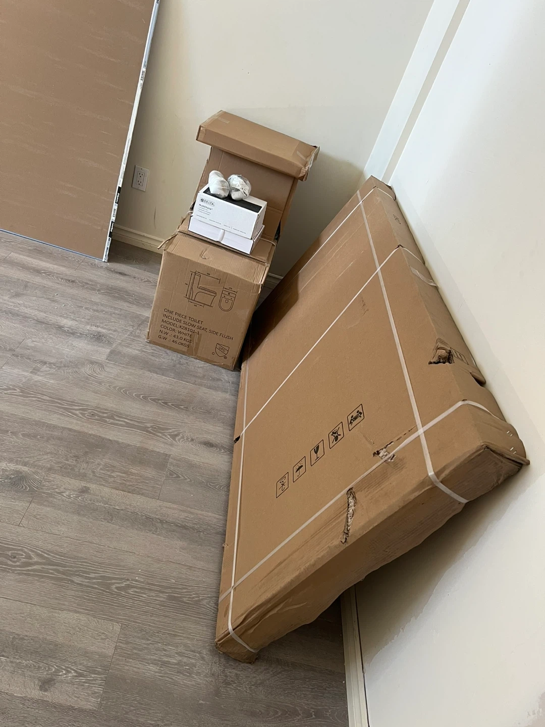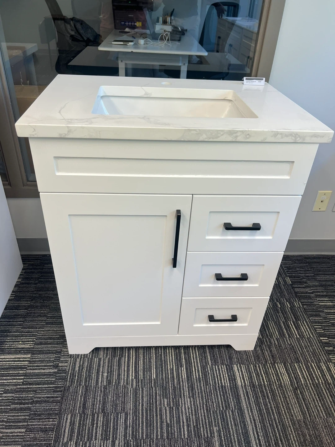 Selling a bathroom vanity with a sink. It's white with a marble-look countertop. The vanity has a door and three drawers for storage. Great for a bathroom renovation!