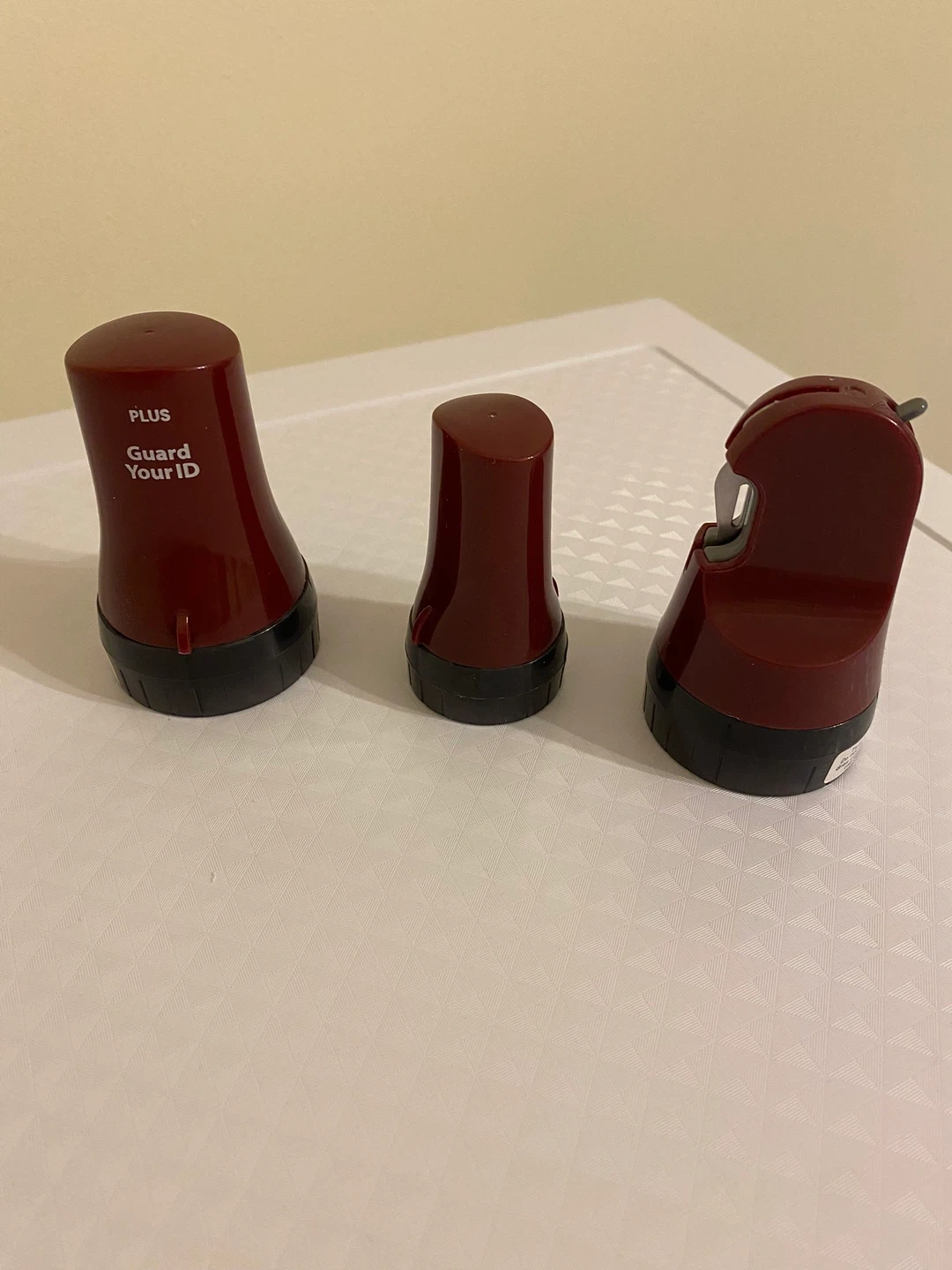 Selling a set of PLUS Guard Your ID roller stamps! These are great for blocking out sensitive information on documents and mail. The set includes three different types of stamps for different needs. Comes in two colours BURGUNDY AND BLUE. Asking $25 per box