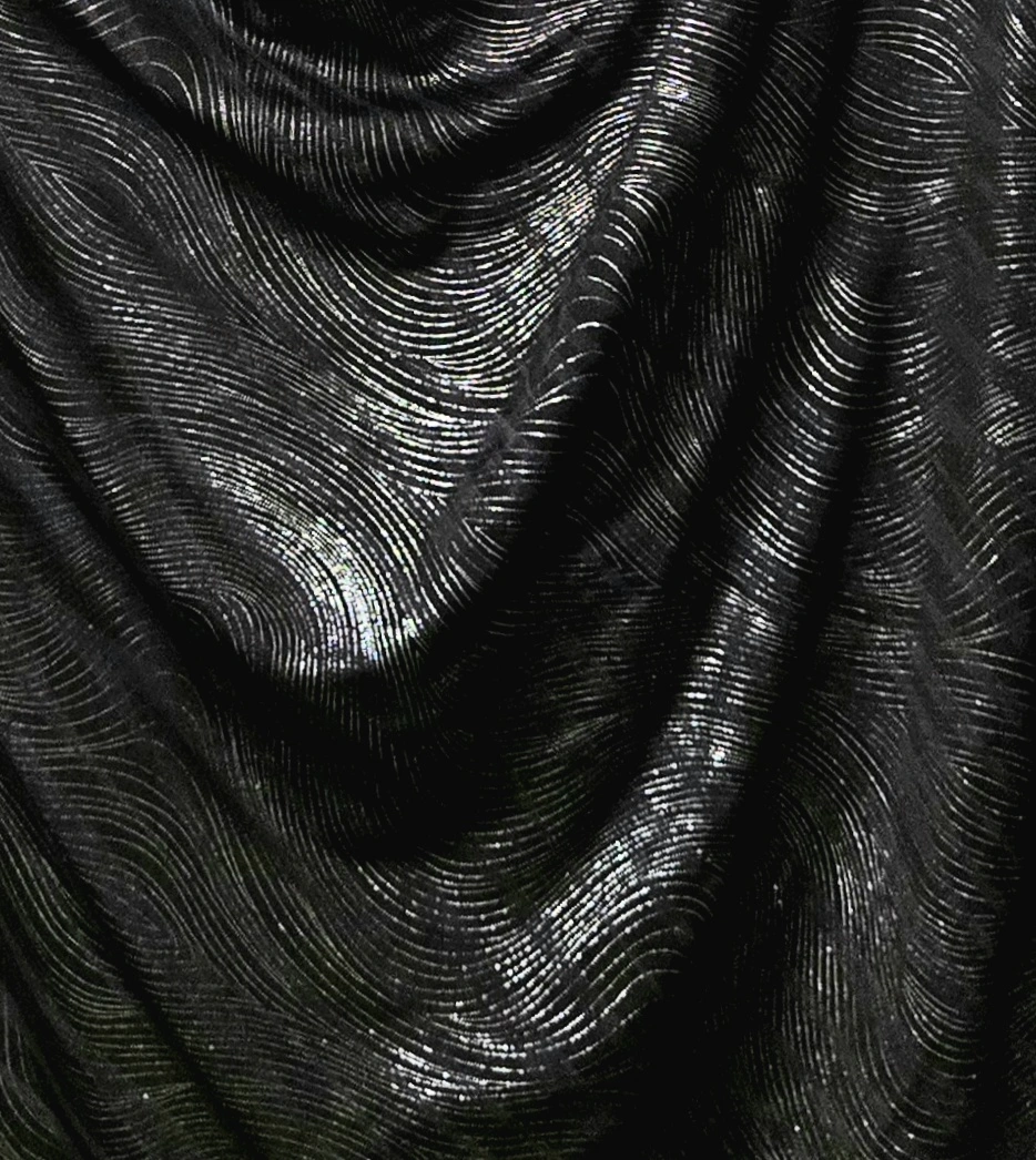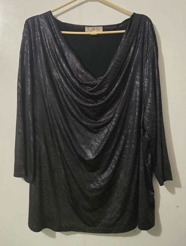 A lovely, shiny black three quarter sleeve top! It has a unique wave-like pattern throughout the fabric and a stylish cowl neckline. Perfect for dressing up or down. The fabric is shiny and it's in excellent condition.