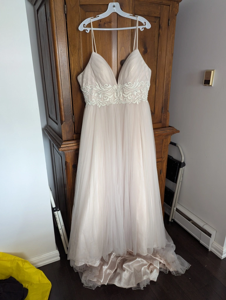 This beautiful lavender wedding dress was oiginally bought for $1200. lt features a delicate tulle overlay and intricate detailing on the bodice. The dress fits size 18-22, has a flattering silhouette and is in great condition (literally worn once).