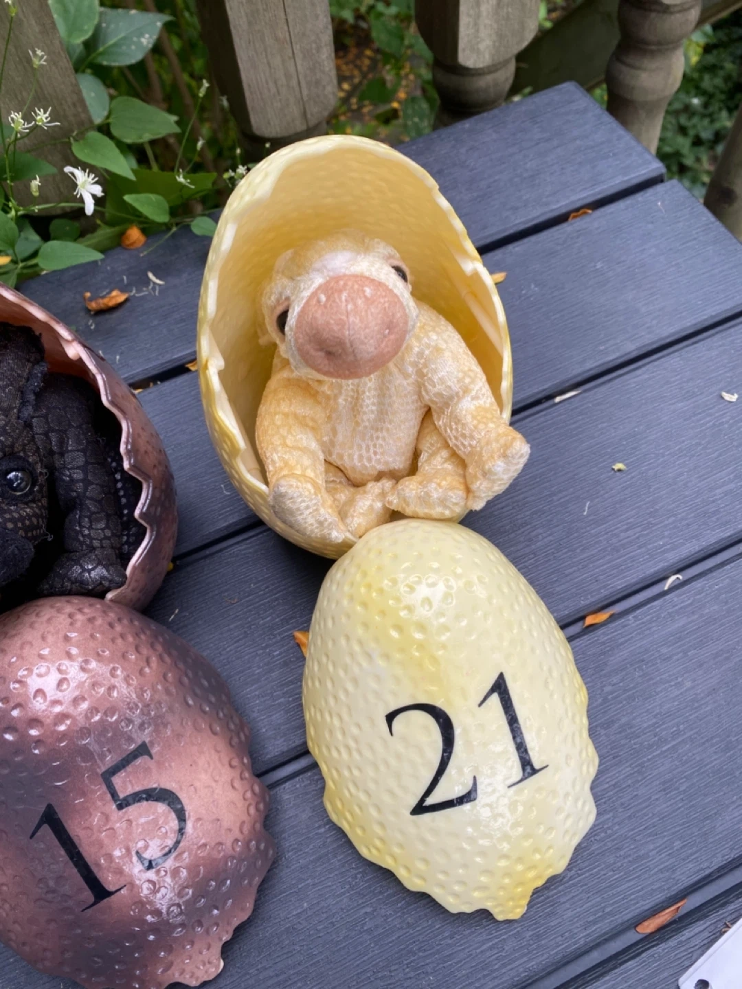 Here's an adorable plush dinosaur sitting inside a decorative egg shell! It's marked with the number 21. A cute addition to any collection