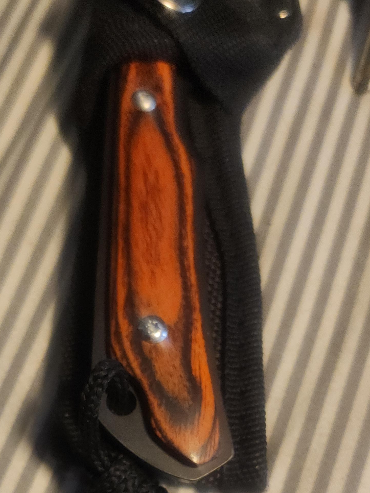 Selling a pocket knife with a unique wood grain handle. It comes with a black nylon sheath, perfect for keeping it safe when not in use. The handle is orange and black wood grain with silver rivets. It also has a lanyard hole for easy carrying