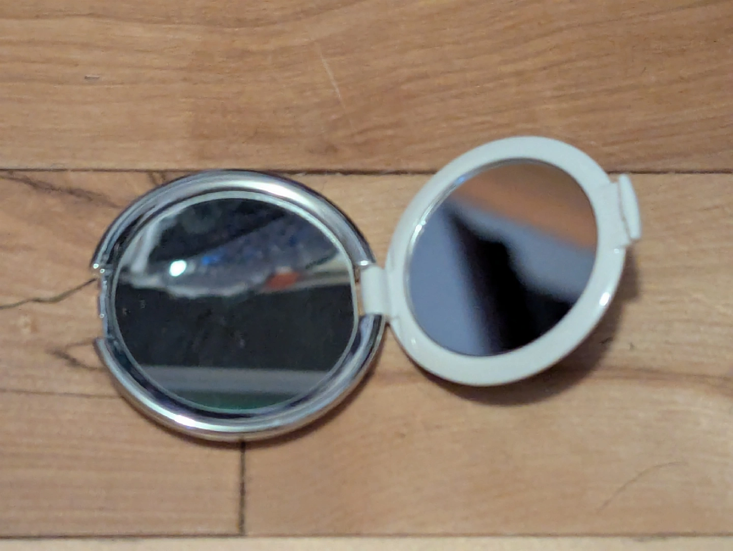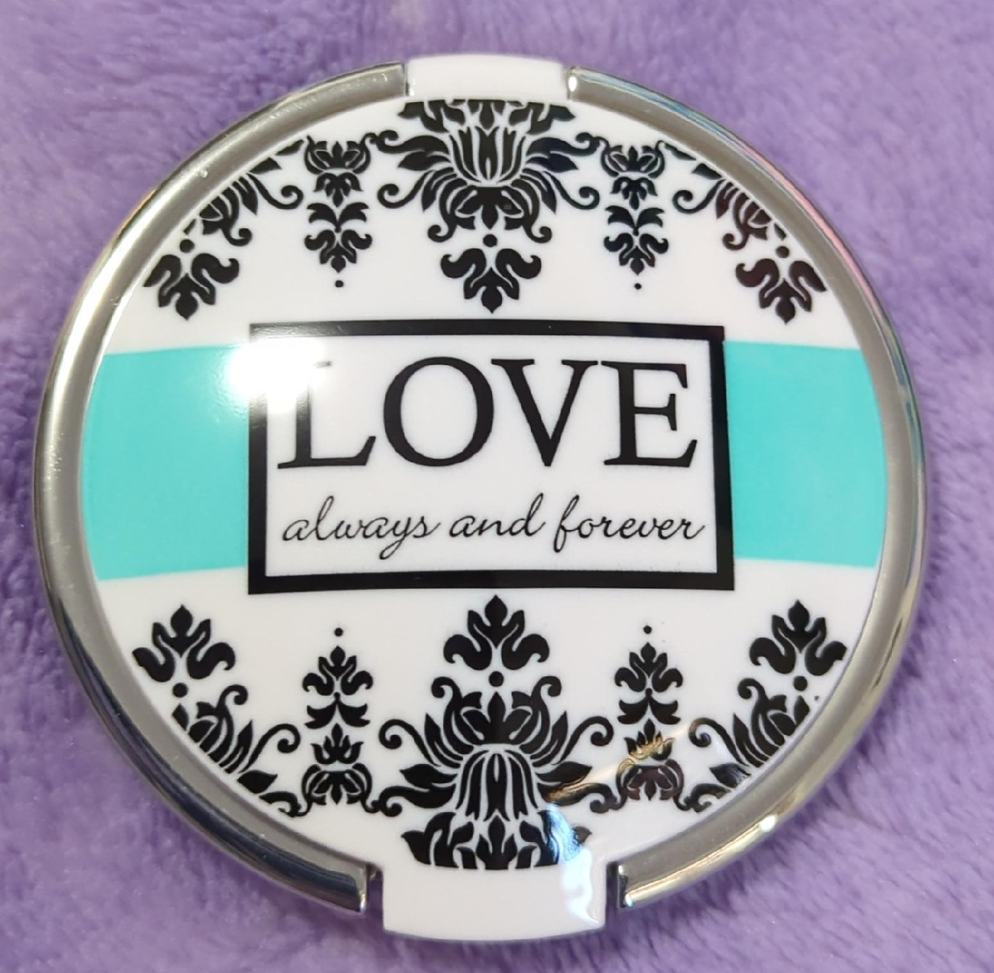 A cute little pocket mirror with a design that says 'LOVE always and forever'.