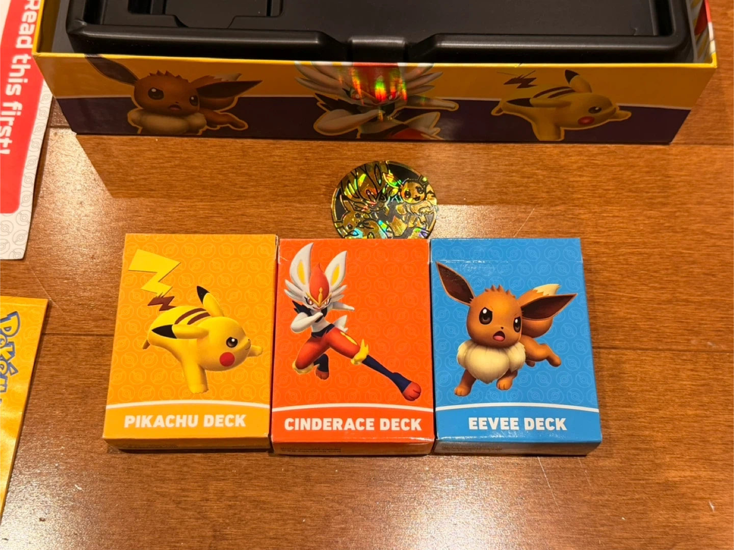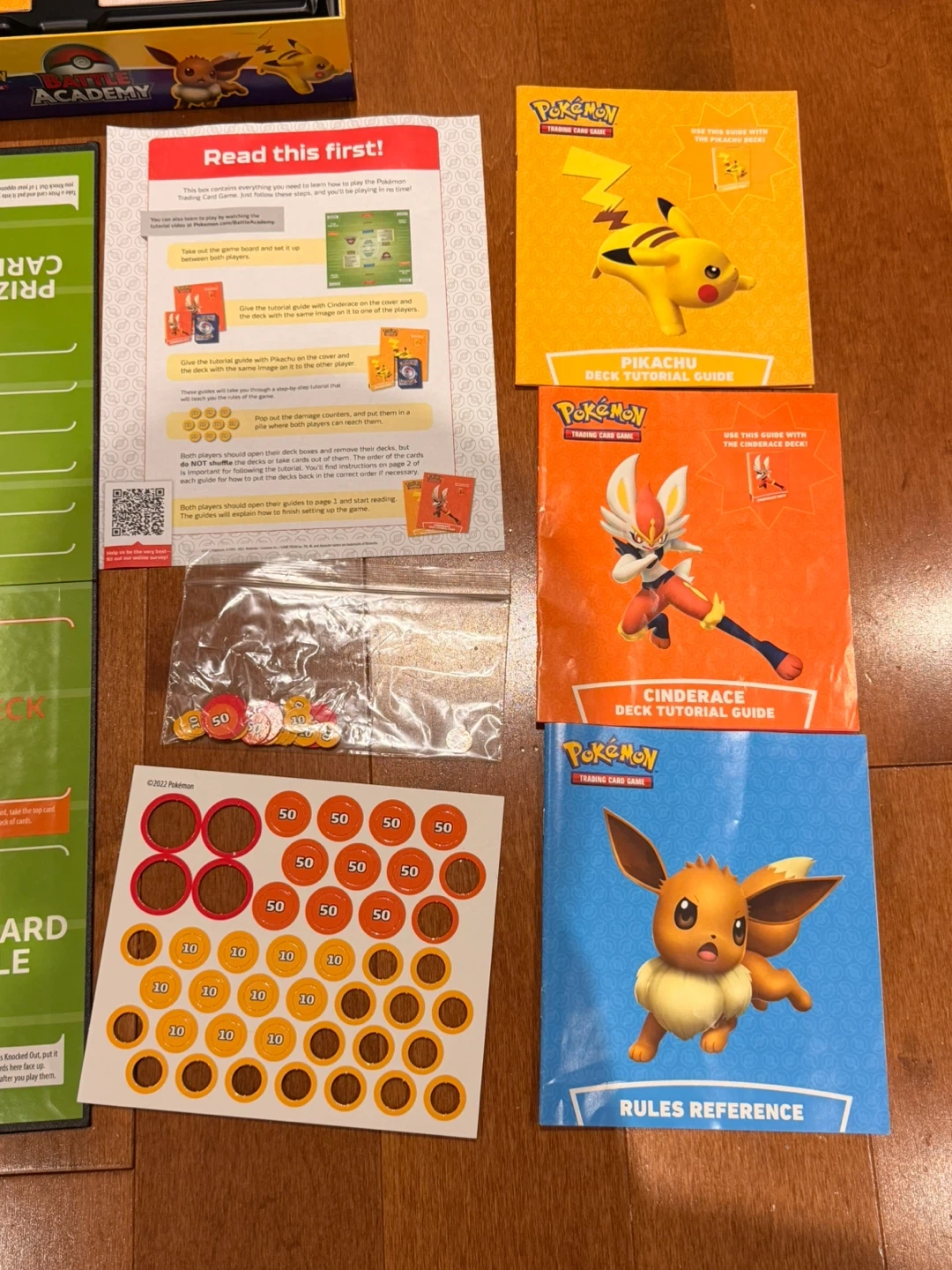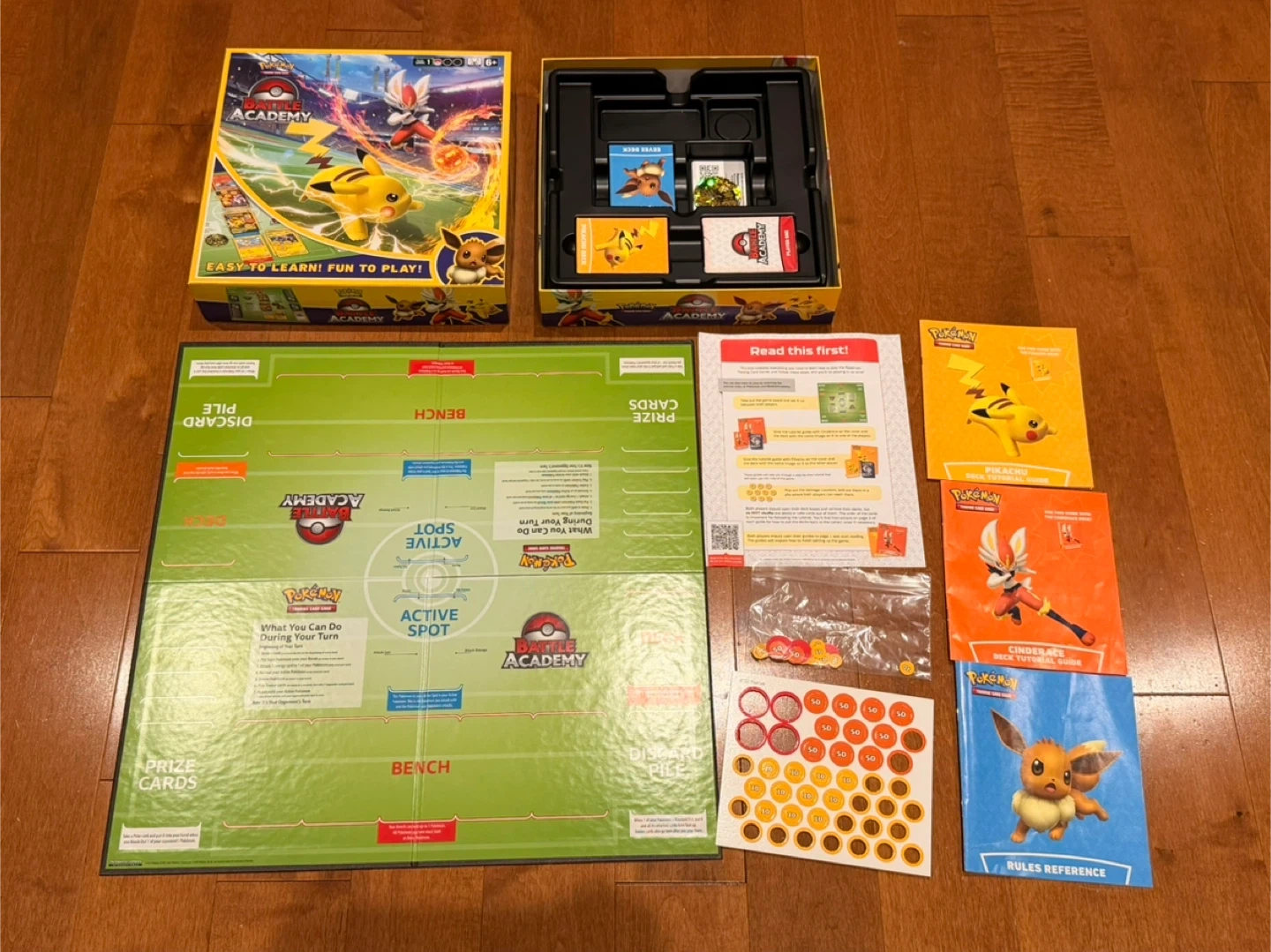Pokémon Battle Academy Trading Card Game Selling a Pokémon Battle Academy trading card game! This set is perfect for anyone looking to learn how to play the Pokémon Trading Card Game. It's easy to learn and fun to play. Included are the Pikachu, Cinderace, and Eevee decks, along with the game board, damage counters, and rules reference. Get ready to battle! Should be a complete set or very close to it. I don’t understand how to play and so we barely took everything out. The kids just spent time looking at the cards. The coins have not all been popped out of the cardboard it came in. Retails for $29.99 Clean, smoke free home Pick up in North Ajax