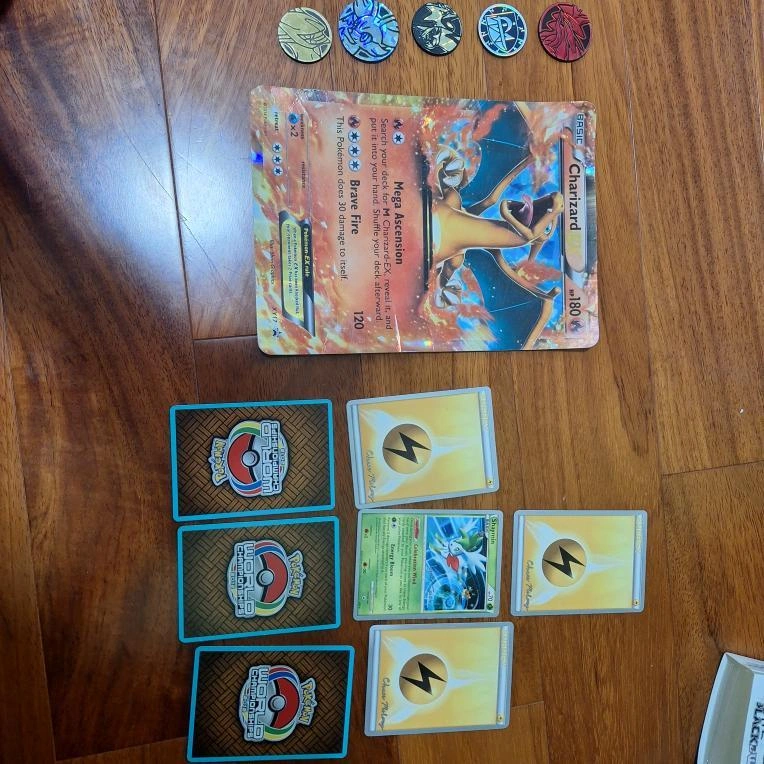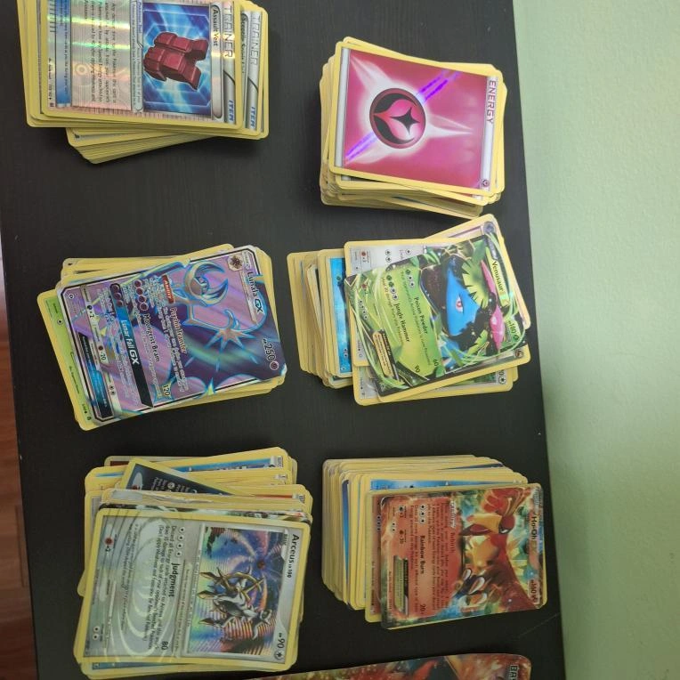 Selling a collection of Pokémon cards. Around 500 cards, including trainers, energy, basics stage 1,2 ex and a gx. Also includes 3 card sleeve and some game coins