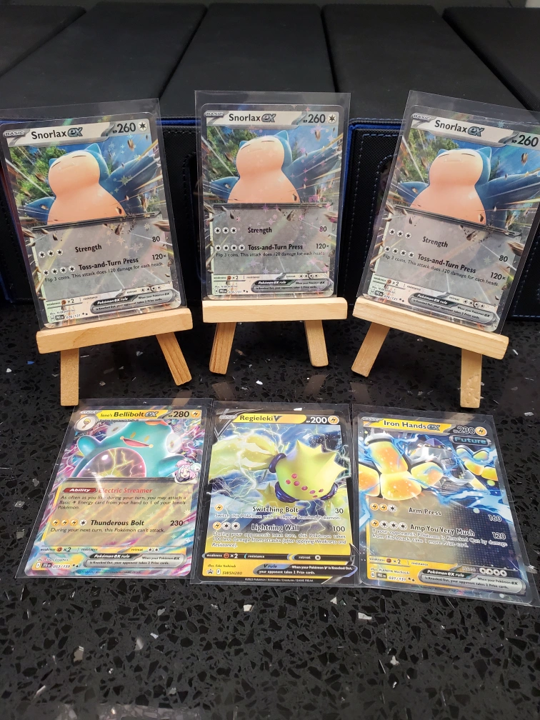 Selling a collection of Pokémon cards! Includes Snorlax GX, Bellibolt EX, Regieleki V, and Iron Hands EX. All cards are in great condition and ready for a new home ALL FRESH FROM PACKS INTO SLEEVES NM GREAT WAY TO START A COLLECTION