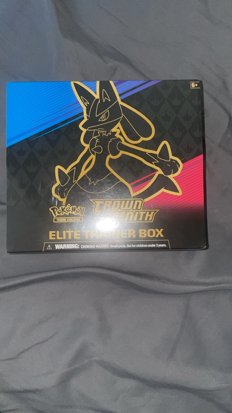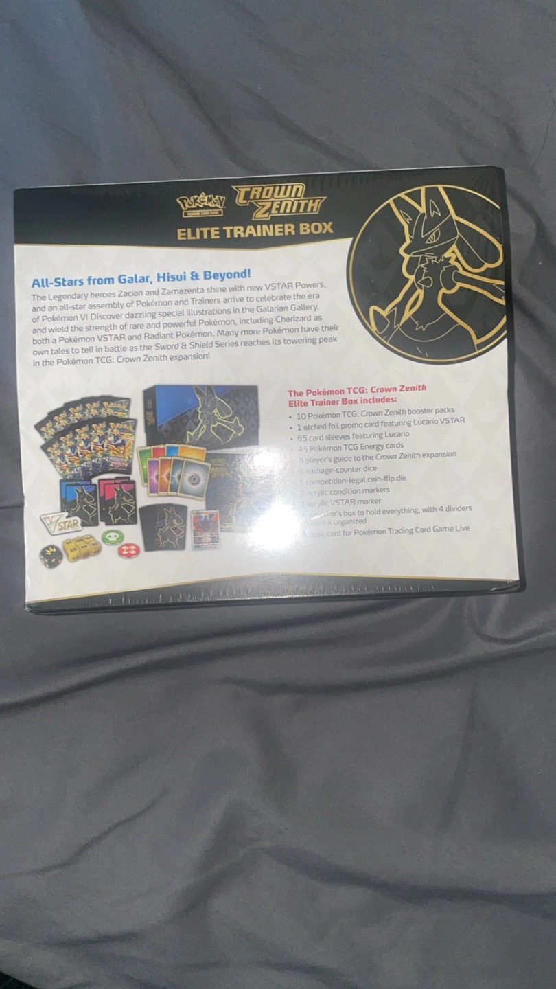 Selling a Pokémon TCG: Crown Zenith Elite Trainer Box! This includes: - 10 Pokémon TCG: Crown Zenith booster packs - 1 foil promo card featuring Lucario VSTAR - 65 card sleeves featuring Lucario - 45 Pokémon TCG Energy cards - A player's guide to the Crown Zenith expansion - 6 damage-counter dice - 1 competition-legal coin-flip die - 2 acrylic condition markers - 1 acrylic VSTAR marker - A collector's box to hold everything, with 4 dividers
