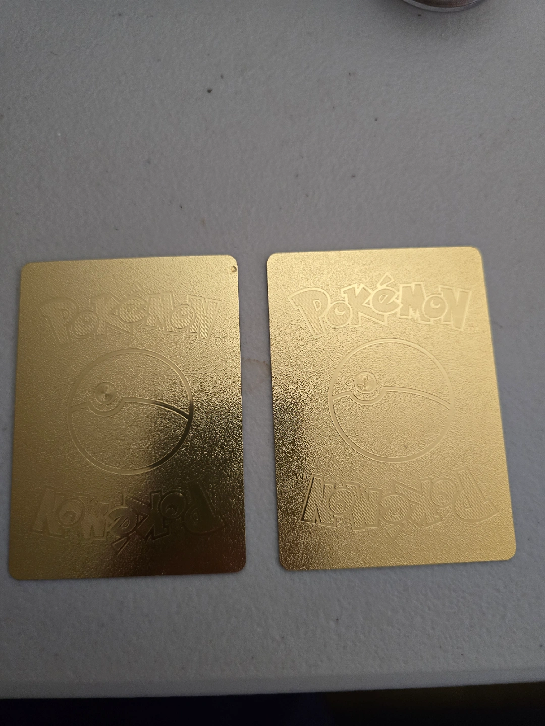 Selling two metal Pokémon cards! One is a Pikachu Mega Sableye and the other is a Charizard V. They're both gold coloured and in great condition