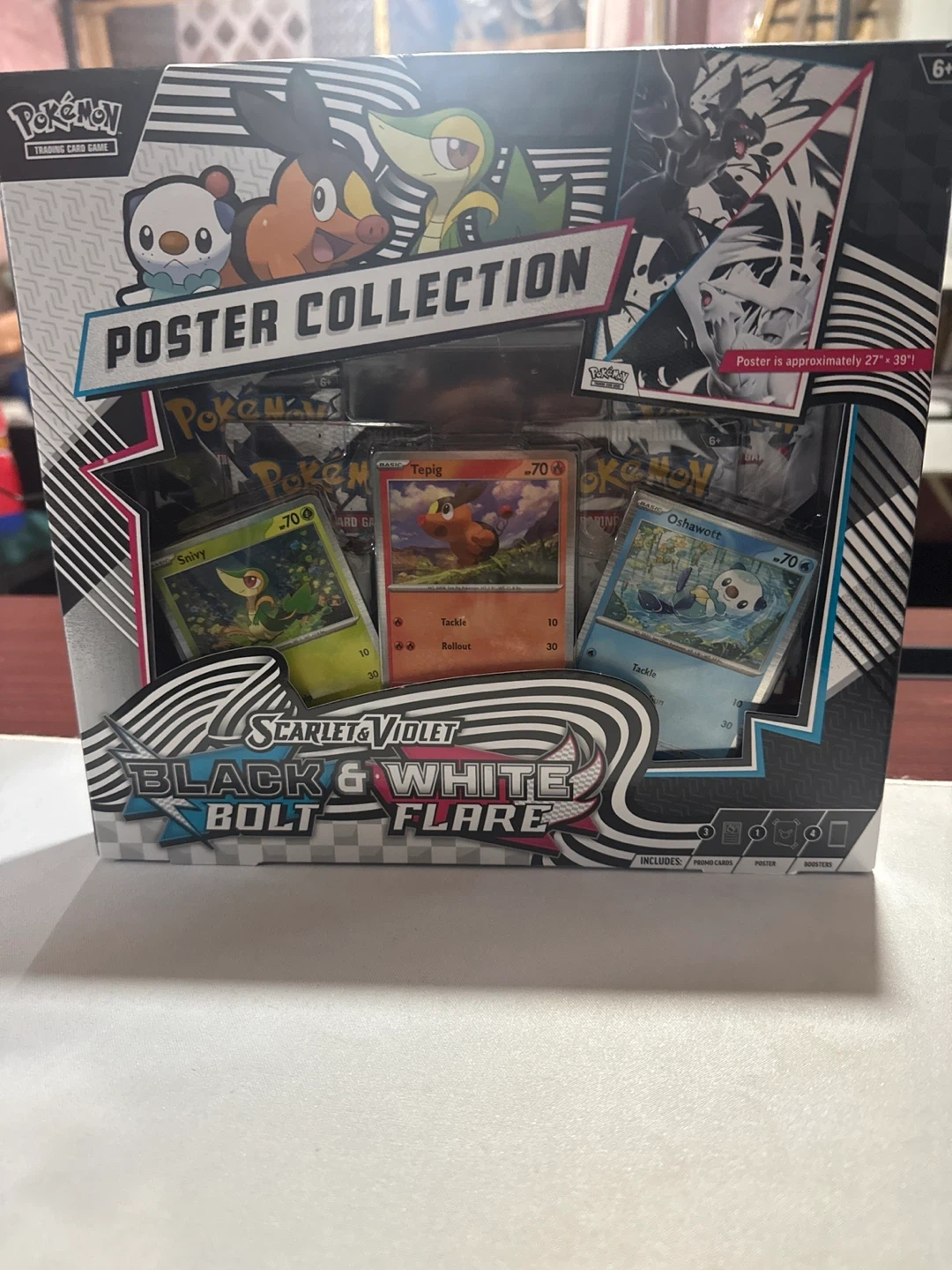 Selling a brand new Pokémon Trading Card Game poster collection! This is the Scarlet & Violet Black & White Bolt Flare edition. It includes promo cards, a poster (approximately 27" x 39"), and booster packs. Perfect for any Pokémon fan!