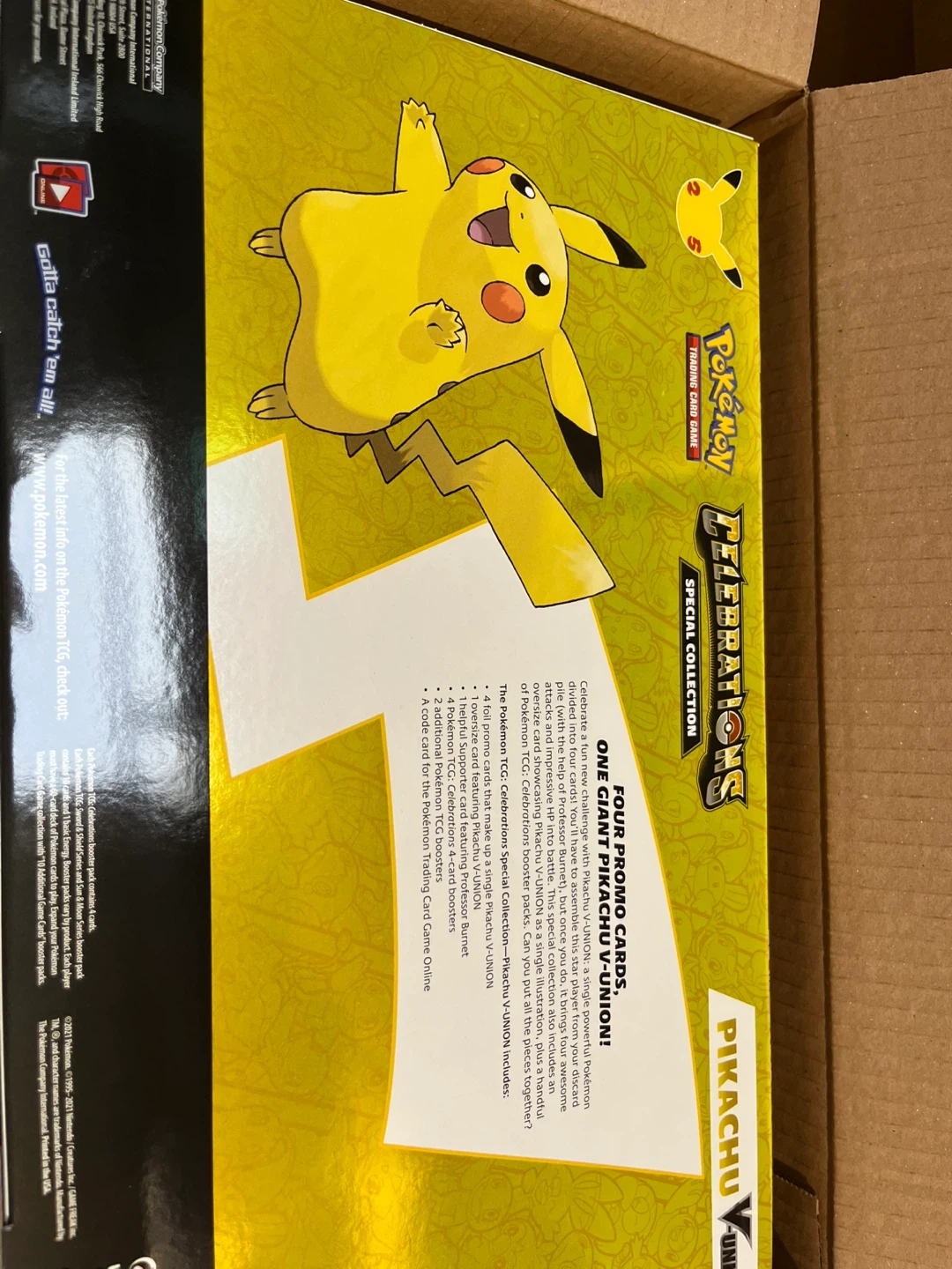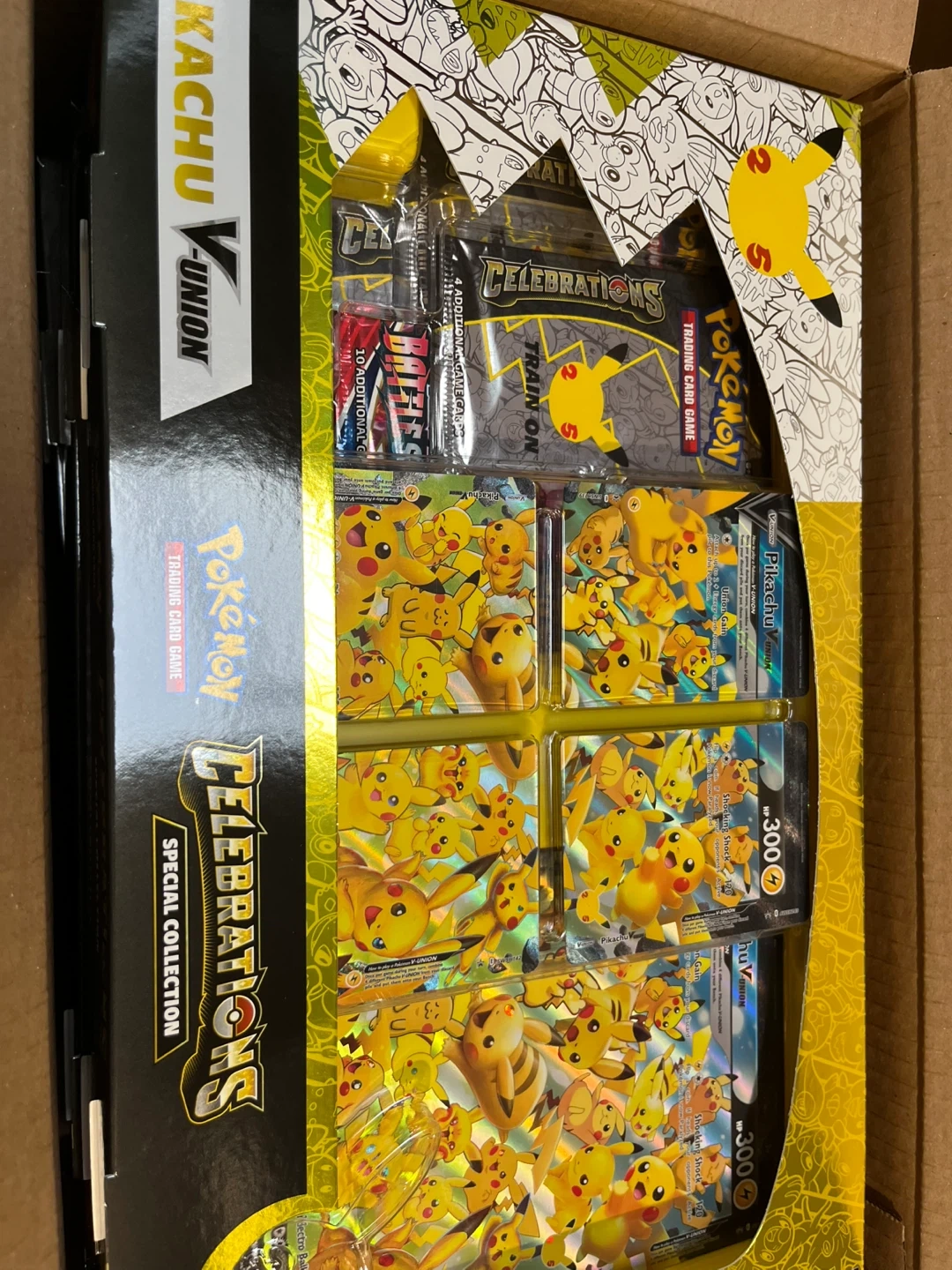 Selling a Pokémon TCG Celebrations Pikachu V-Union Special Collection! This special collection includes four promo cards to make up a single Pikachu V-UNION, a helpful Supporter card featuring Professor Burnet, four Pokémon TCG: Celebrations 4-card boosters, two additional Pokémon TCG boosters, and a code card for the Pokémon Trading Card Game Online