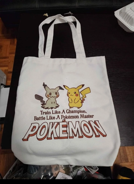 Pokémon-themed tote bags. One features Pikachu with the slogan "I Choose You!" The other shows Pikachu and Gengar with a training quote. Both are white cotton.