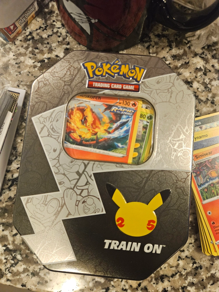 Selling a Pokémon Trading Card Game tin. The tin is a special 'Train On' edition, perfect for storing your cards or for collectors. It includes a selection of Pokémon cards, ready for battling or trading! The tin features a cool design with Pikachu and other Pokémon characters, making it a great addition to any Pokémon fan's collection