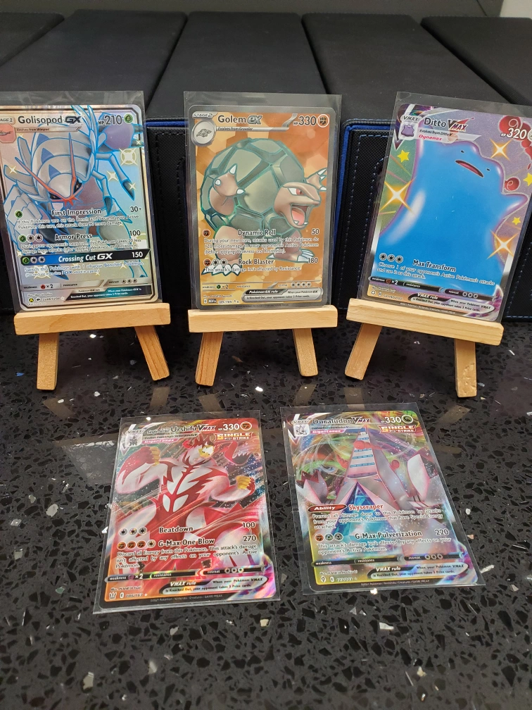 Selling a set of Pokémon trading cards. You'll get Golisopod GX, Golem GX, Ditto VMAX, and others as pictured. All cards are in sleeves and look to be in great shape! Perfect for any Pokémon collector or player the golisopod gx is damage 💔 😢 but needs a new home THE REST IS NM