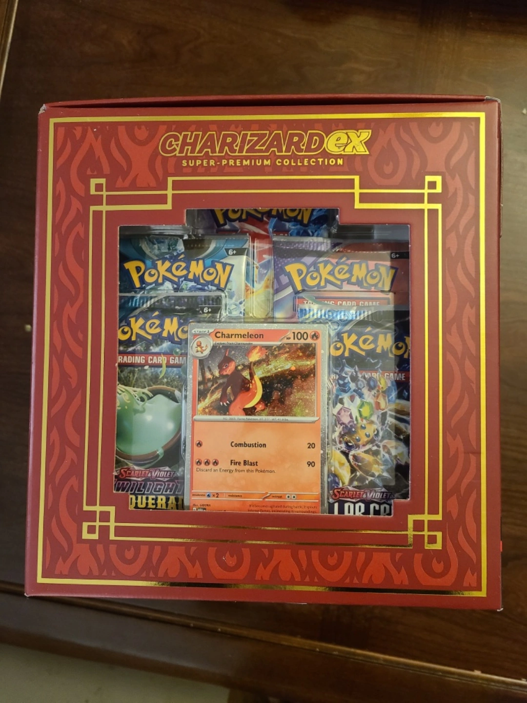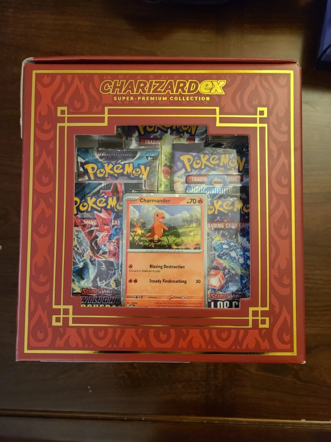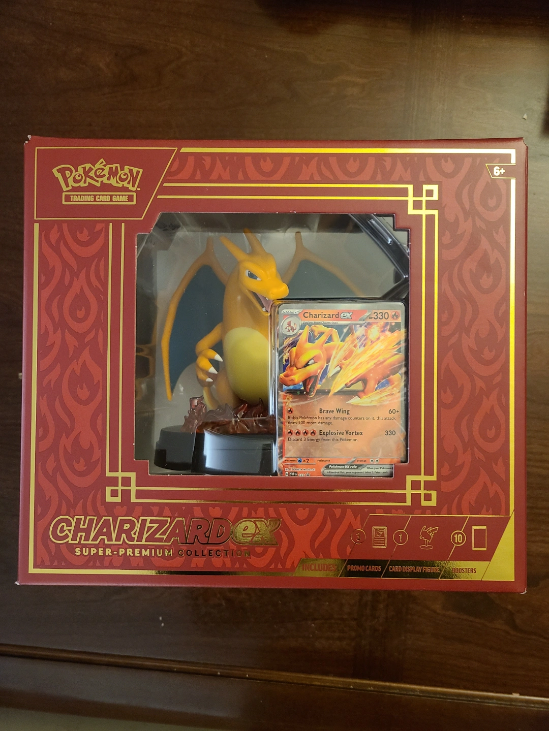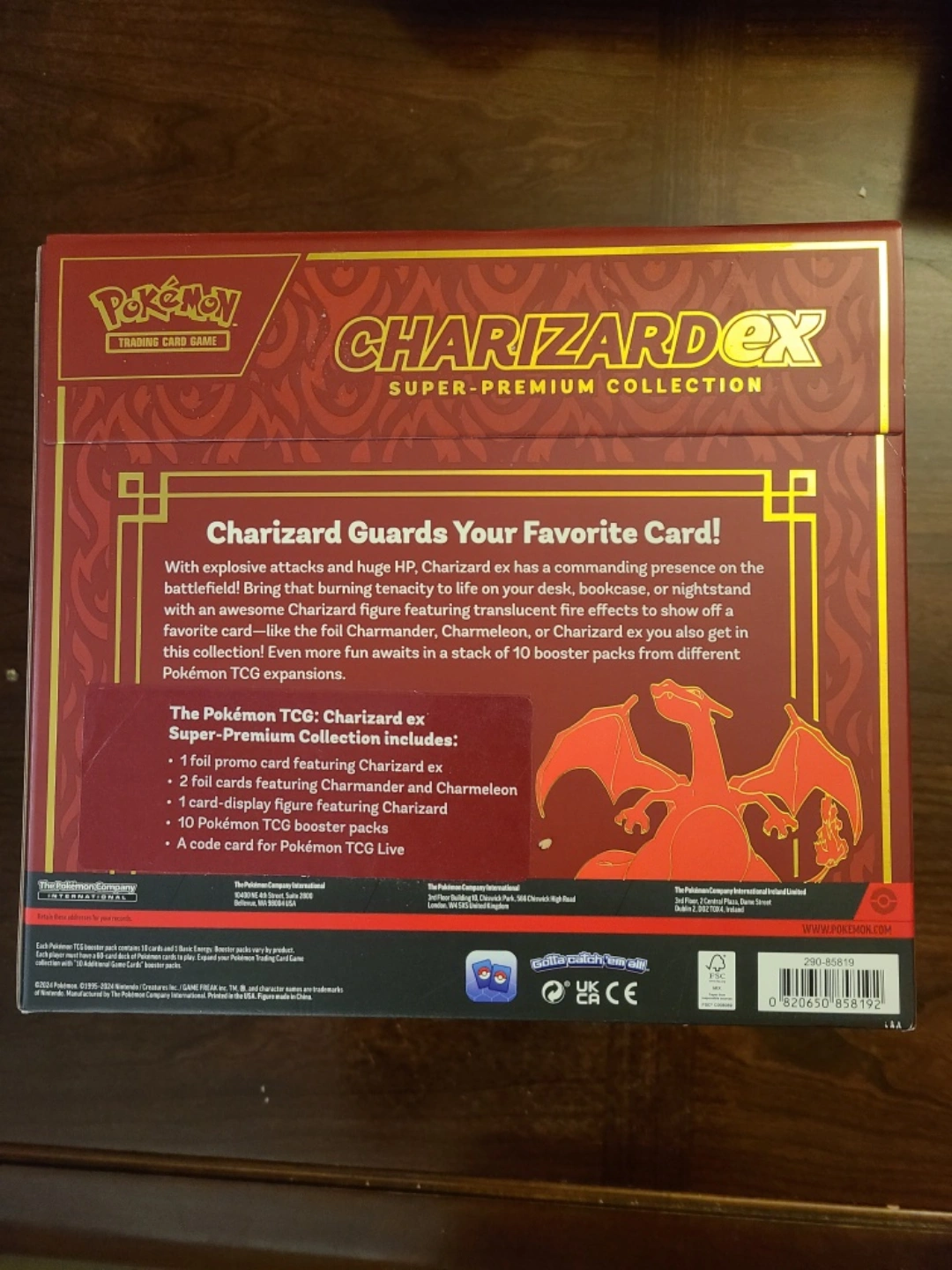 BRAND NEW Charizard ex Super-Premium Collection. Includes: 🔥1 foil promo card featuring Charizard ex 🔥 2 foil cards featuring Charmander and Charmeleon 🔥 1 card display figure featuring Charizard 🔥 10 pokemon TCG booster packs 🔥 A code card for Pokémon TCG Live