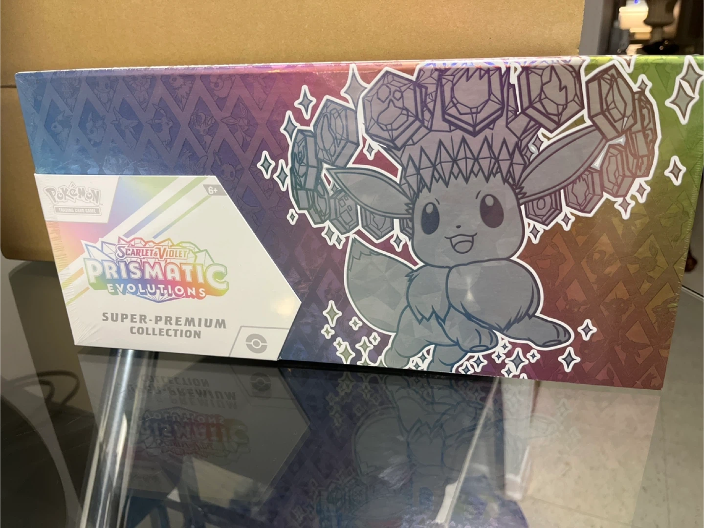 Selling a Pokemon TCG Scarlet & Violet Prismatic Evolutions Super-Premium Collection. This set features Eevee ex, a Fuzzy Eevee deck box, card sleeves featuring Eevee and its Evolutions, and booster packs. It also includes a code card for Pokemon TCG Live