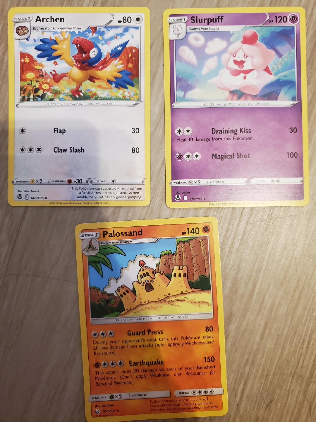 Selling three Pokemon trading cards: Archen, Slurpuff, and Palossand. Brand new