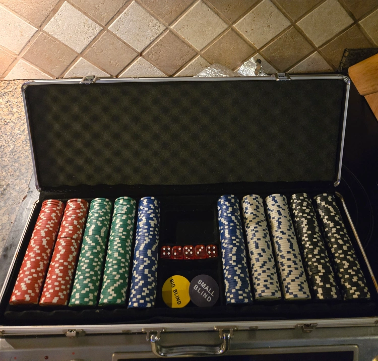 Complete poker chip set. Includes aluminum carrying case, various coloured chips, and dice. Great for game night!