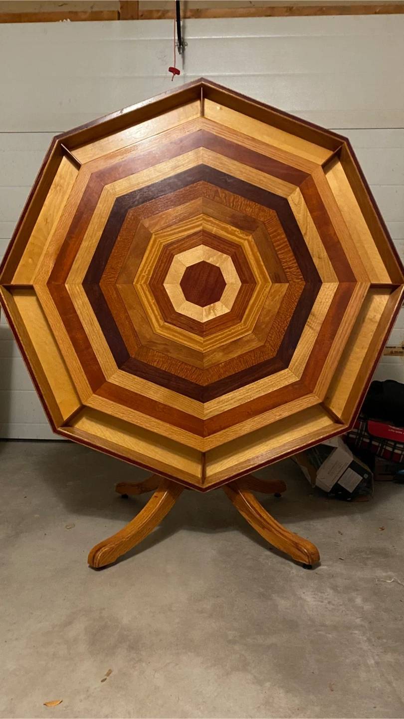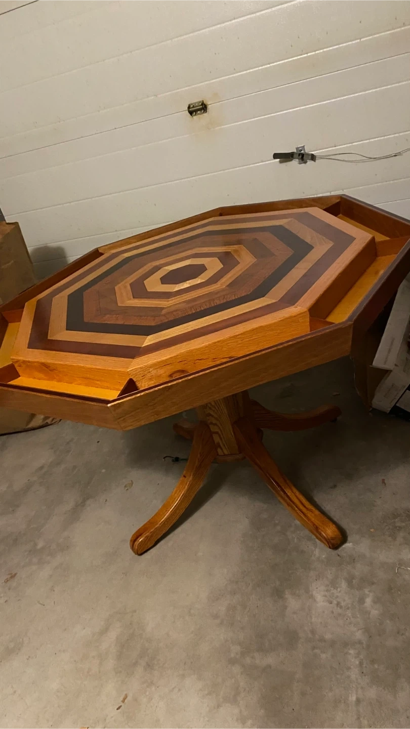 Check out this unique octagon-shaped hand crafted solid oak wood table! It measures approximately 49 inches in height and 57 inches across the top. Top flips up for easy storage. It's a beautiful piece that could add a special touch to any room $2,500 OBO Pick up Stoney Creek