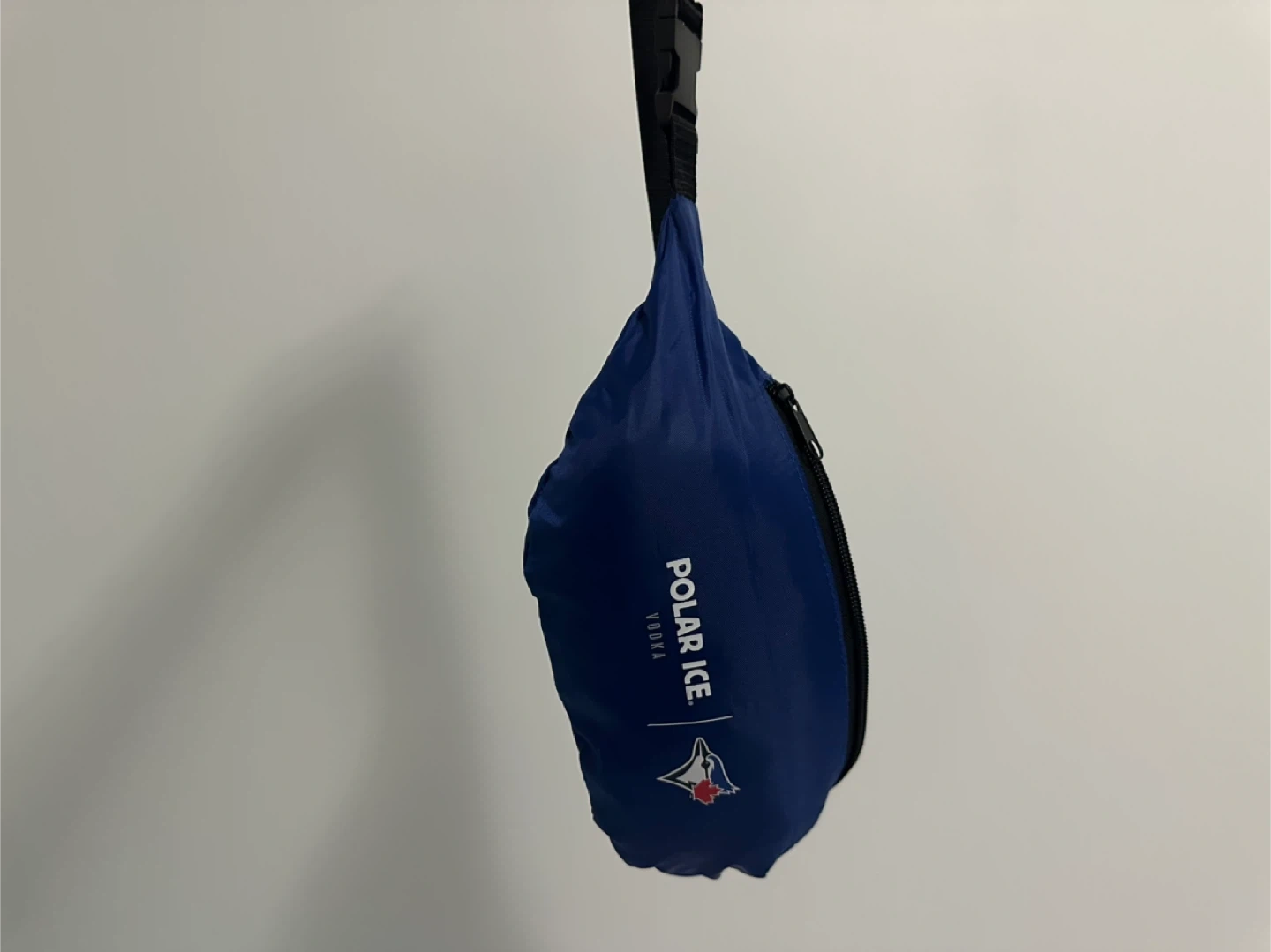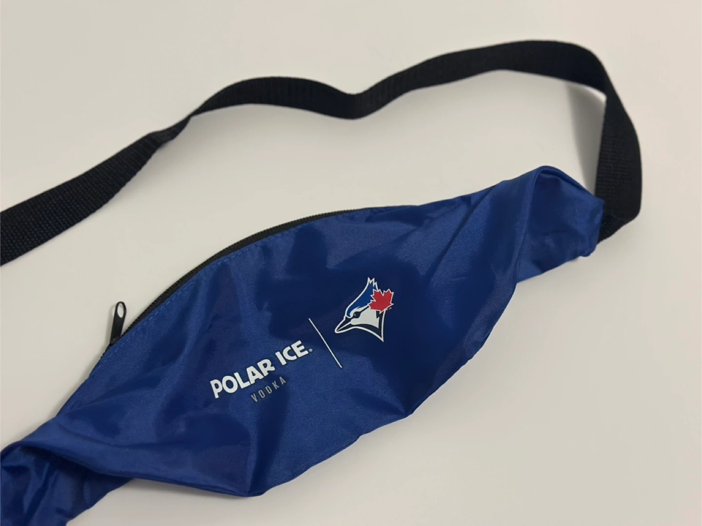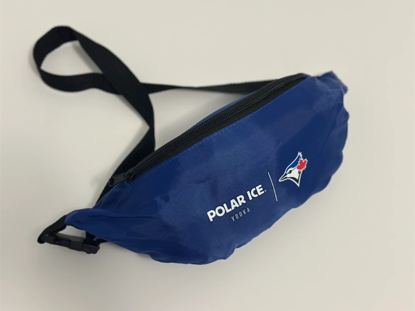 Here's a fun blue fanny pack featuring the Polar Ice Vodka and Toronto Blue Jays logos! It's perfect for keeping your essentials close while showing off your team spirit.