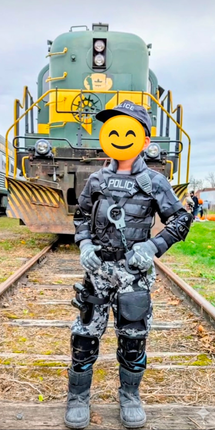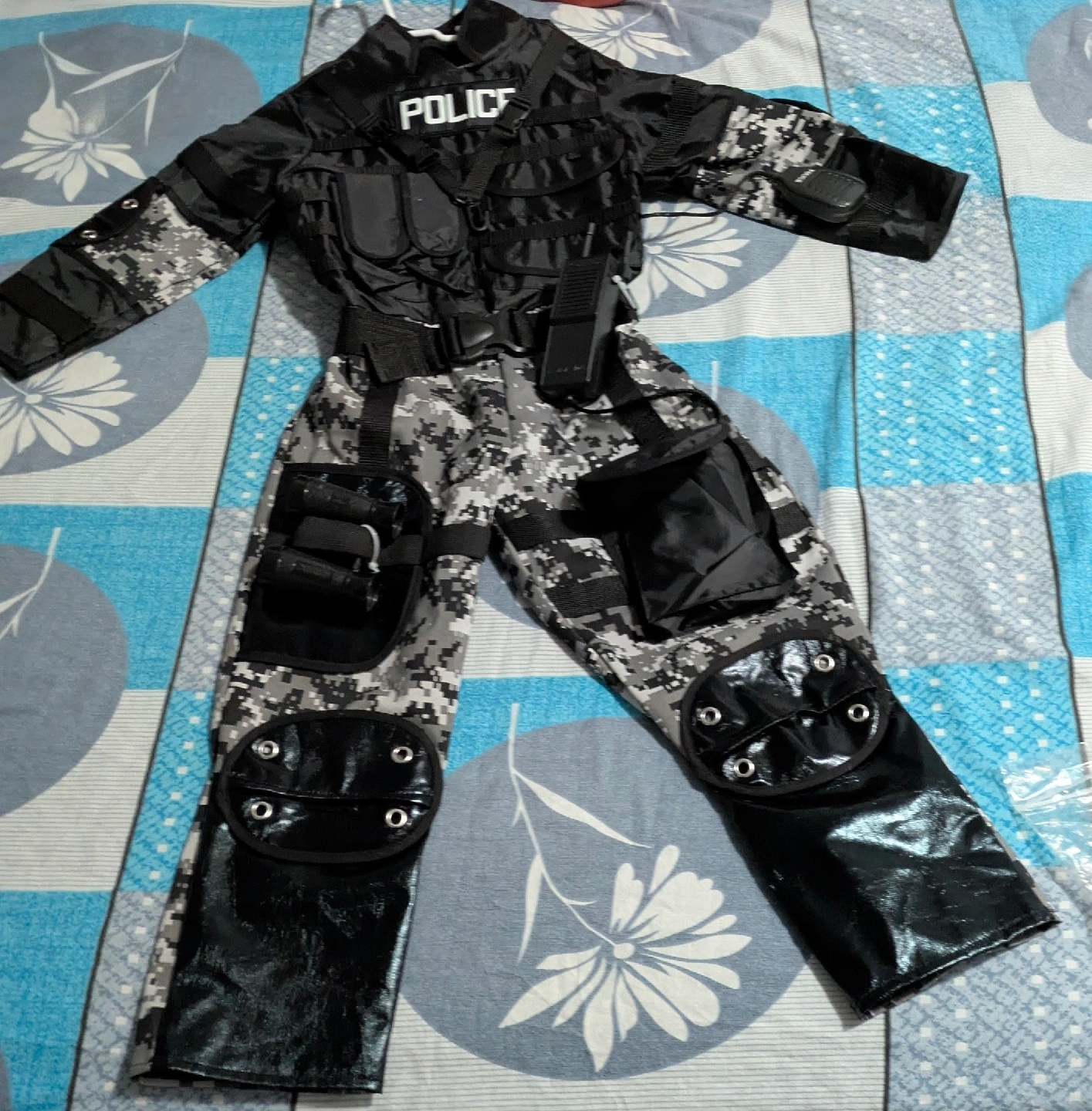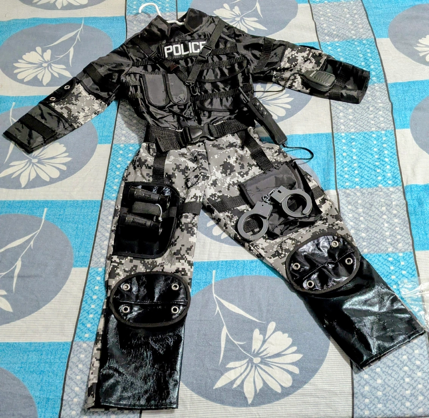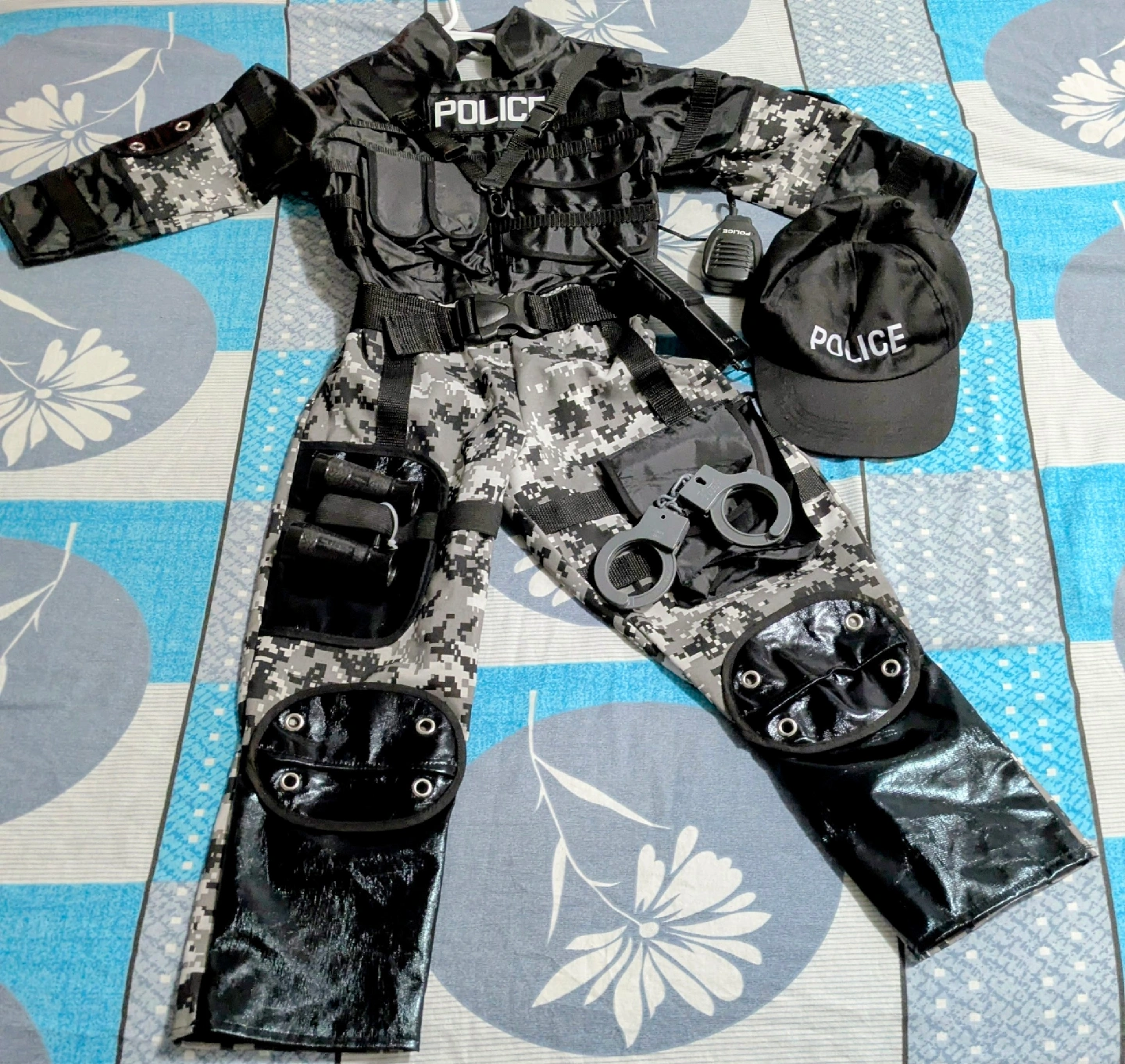 Selling a police costume set. Includes the jacket, pants, belt, and cap. Also comes with accessories like handcuffs and a walkie-talkie. Great for dress-up or Halloween!