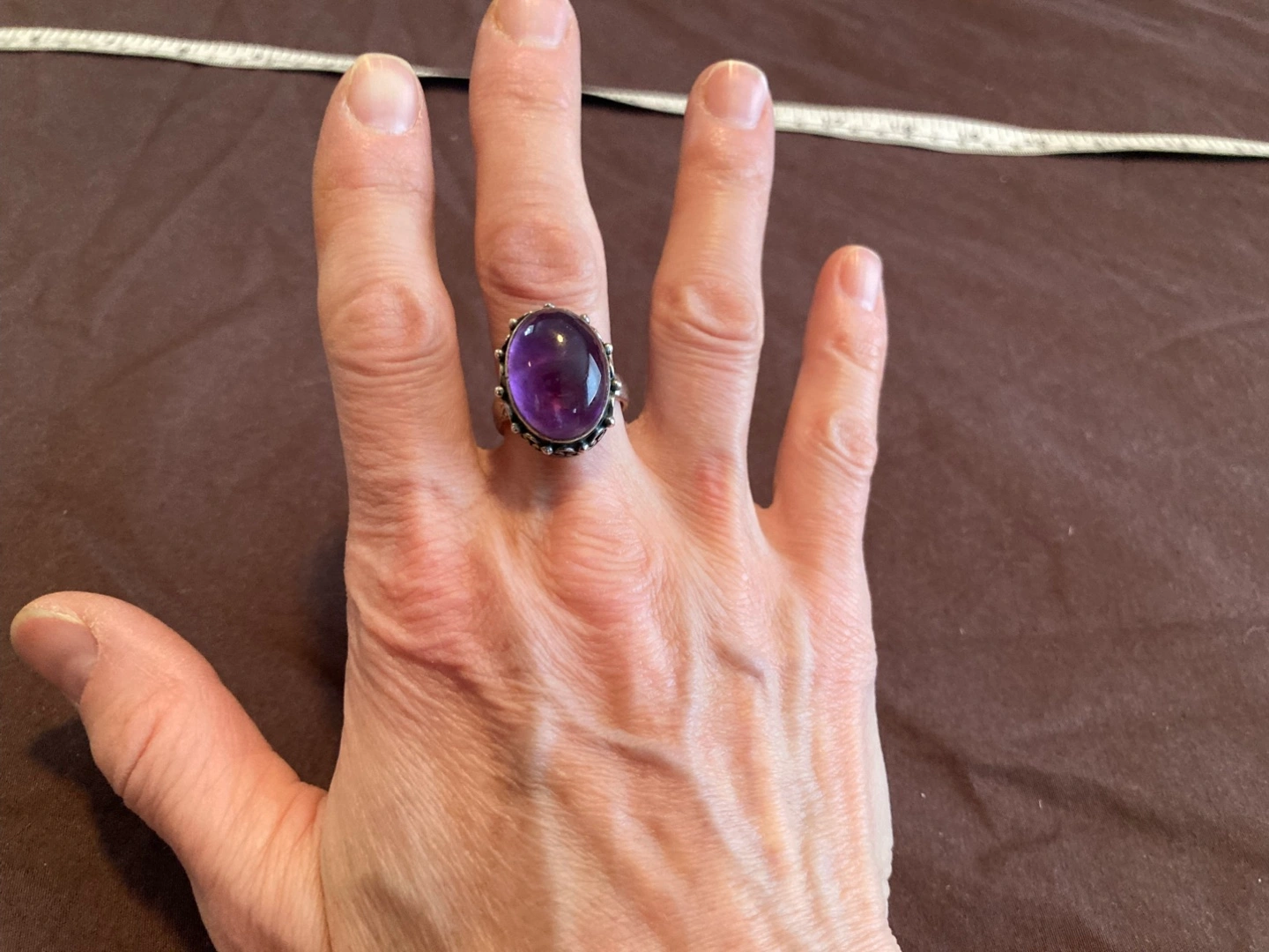 this amethyst is a deep rich purple and polished to a high sheen, set in sterling silver.