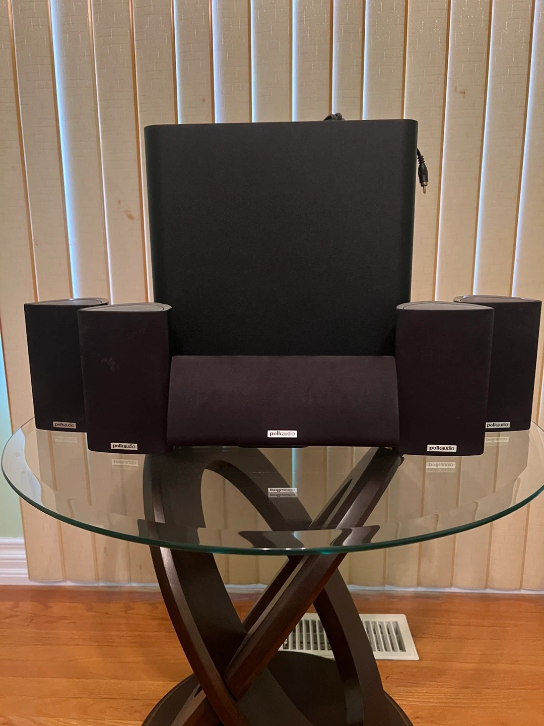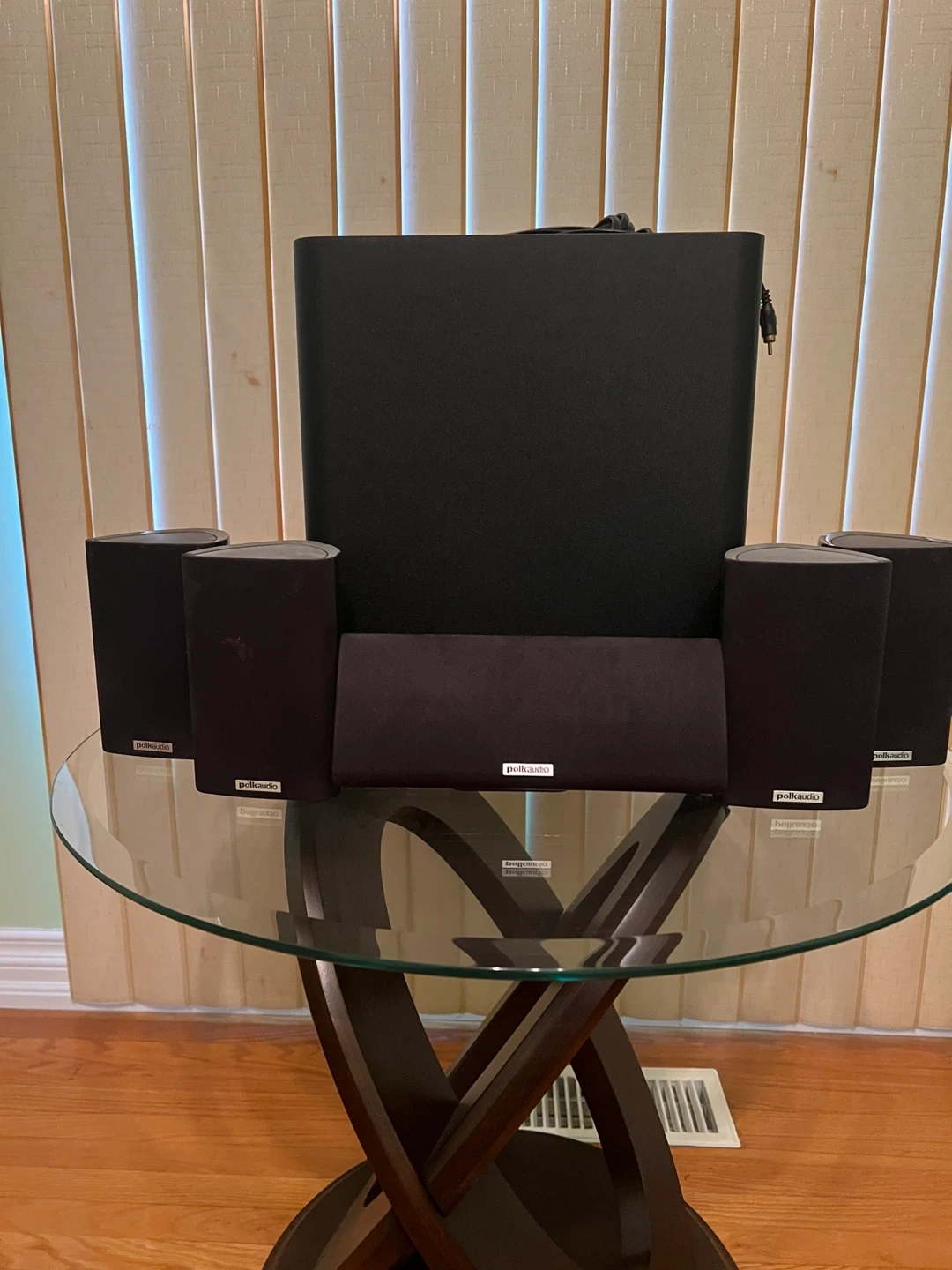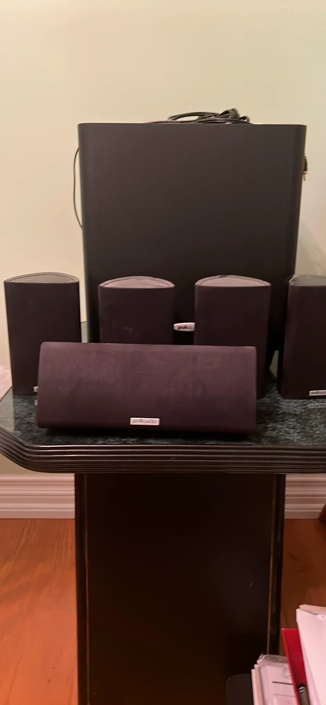 Selling a Polk Audio 5.1 channel home theatre system. Includes five speakers and one subwoofer. Great for enhancing your home entertainment experience!