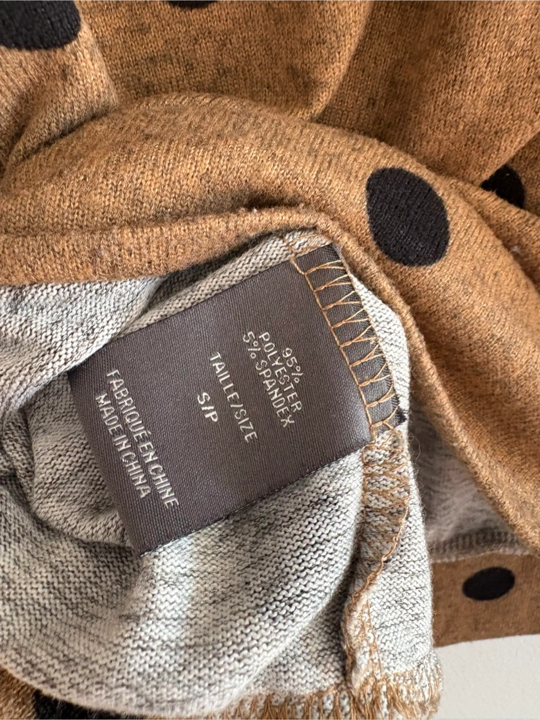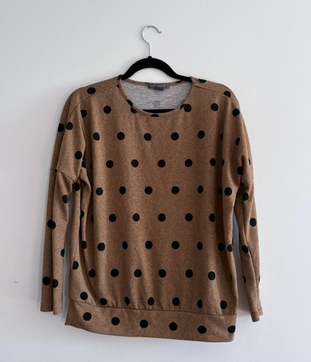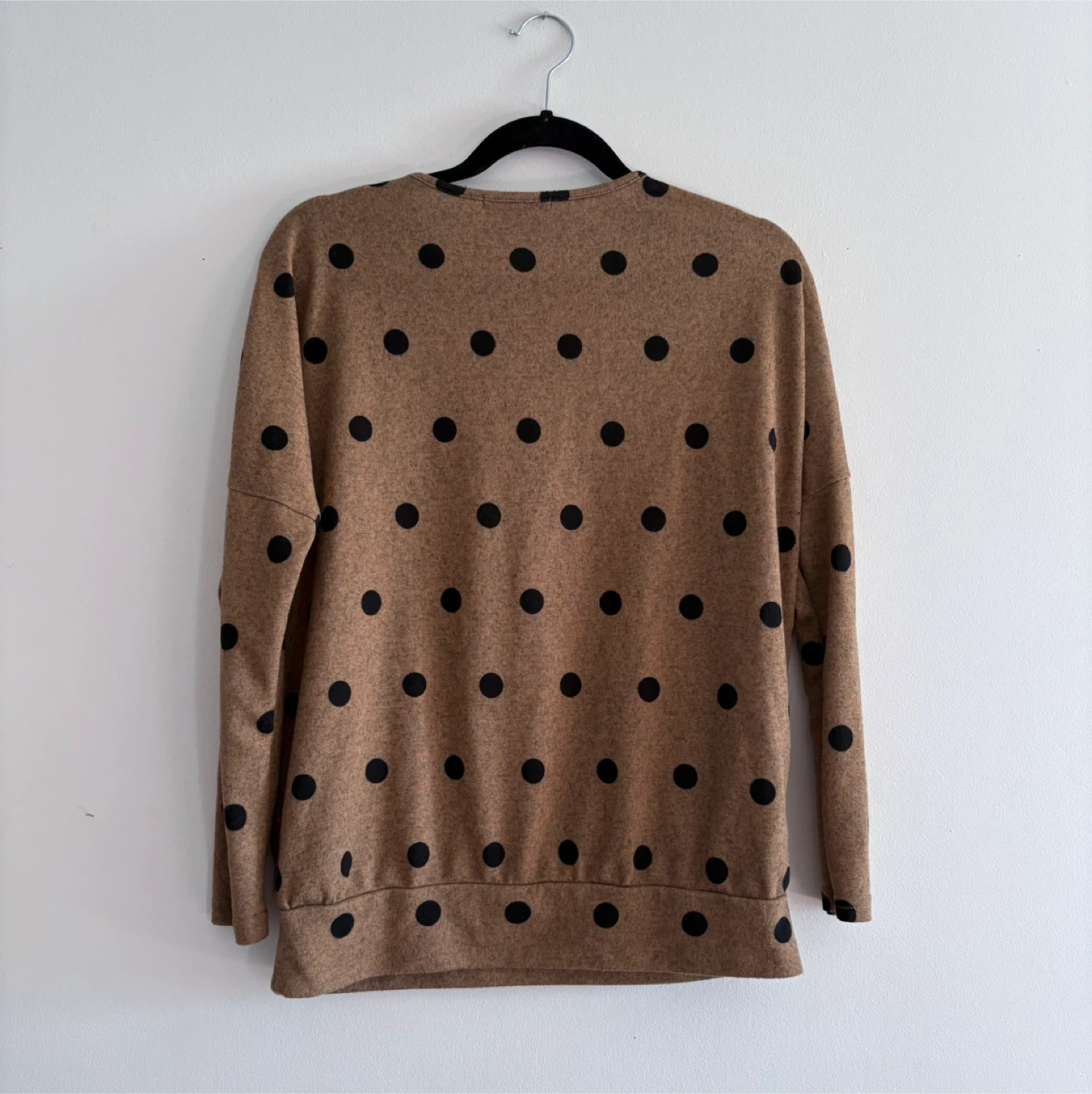 Cute long sleeve top with brown colour with black polka dots! It's a size small and made of 95% polyester and 5% spandex Good condition Price is firm Cash only Pick up please