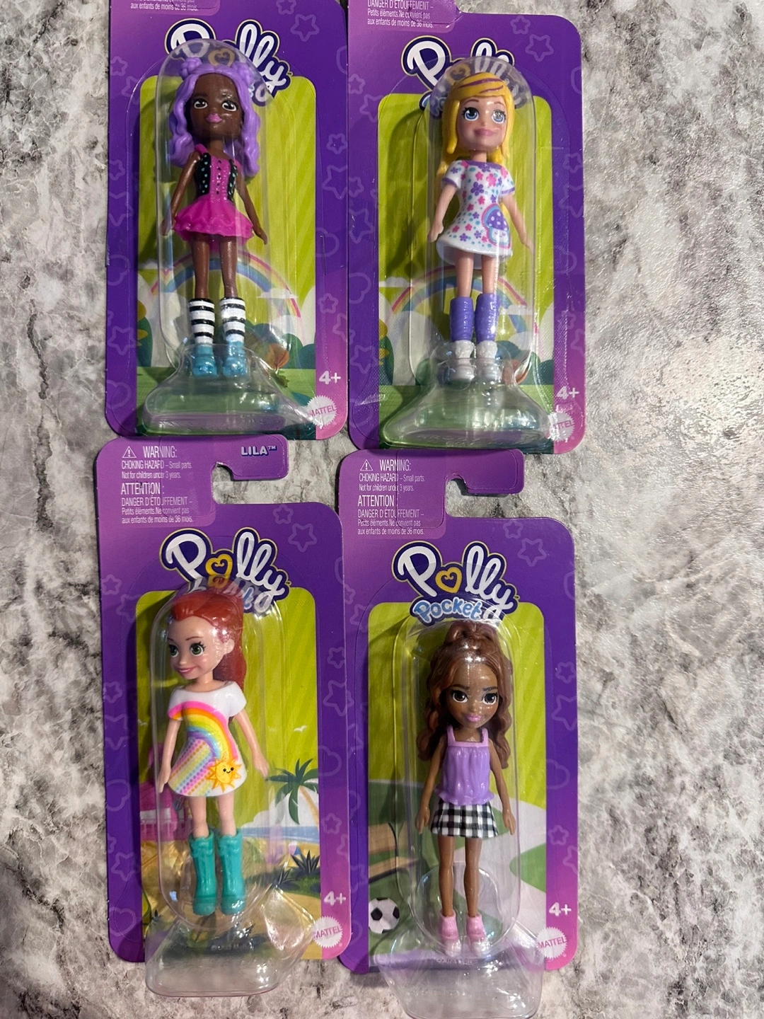 Four Polly Pocket dolls. Collectible miniature figures. New in package. Ages 4+