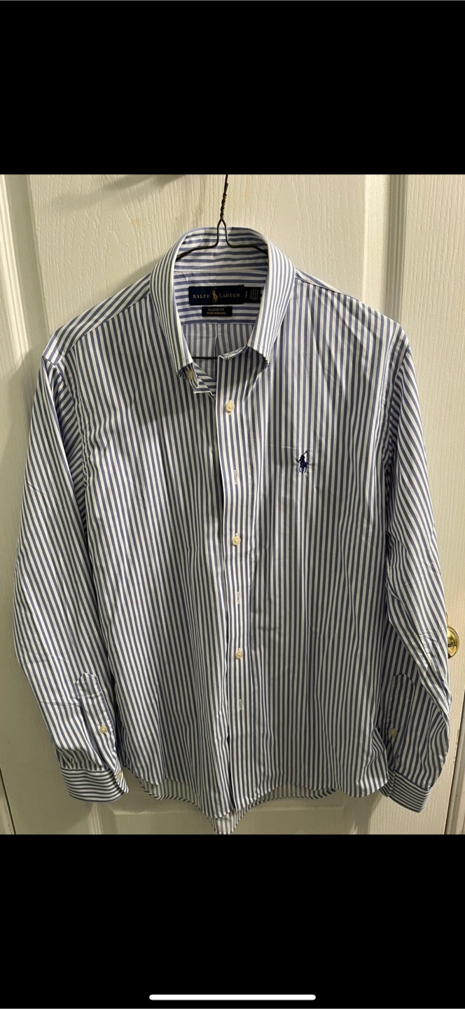 Selling a Ralph Lauren button-down shirt with a blue and white striped pattern! It's in great condition and perfect for a casual or semi-formal look. The classic fit and performance fabric make it a comfortable and stylish choice.