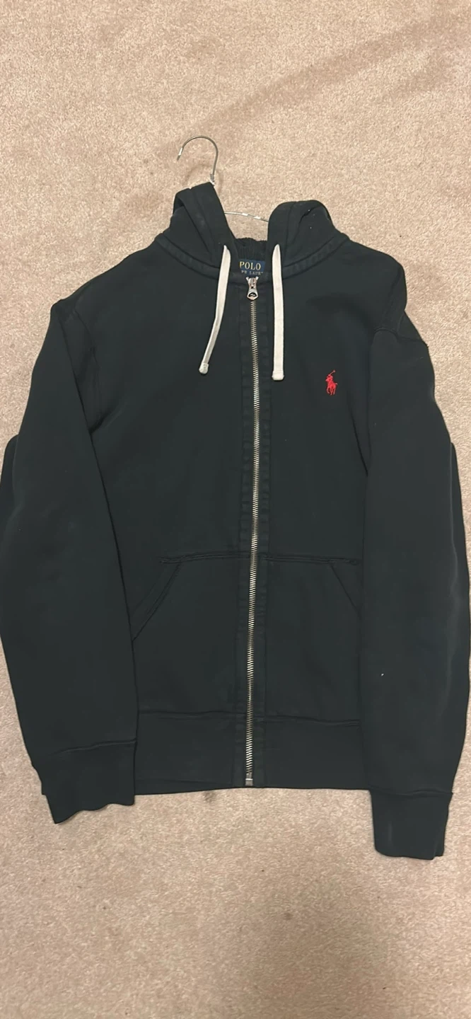 Selling a Polo Ralph Lauren black zip-up hoodie. It's in great condition and perfect for layering! Features the classic Polo logo on the chest and a comfortable fit. A stylish and versatile addition to any wardrobe