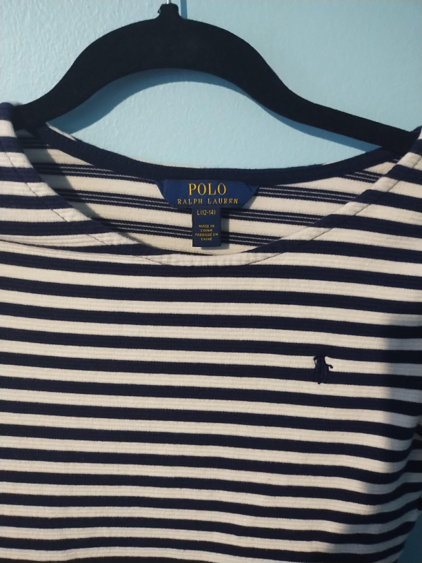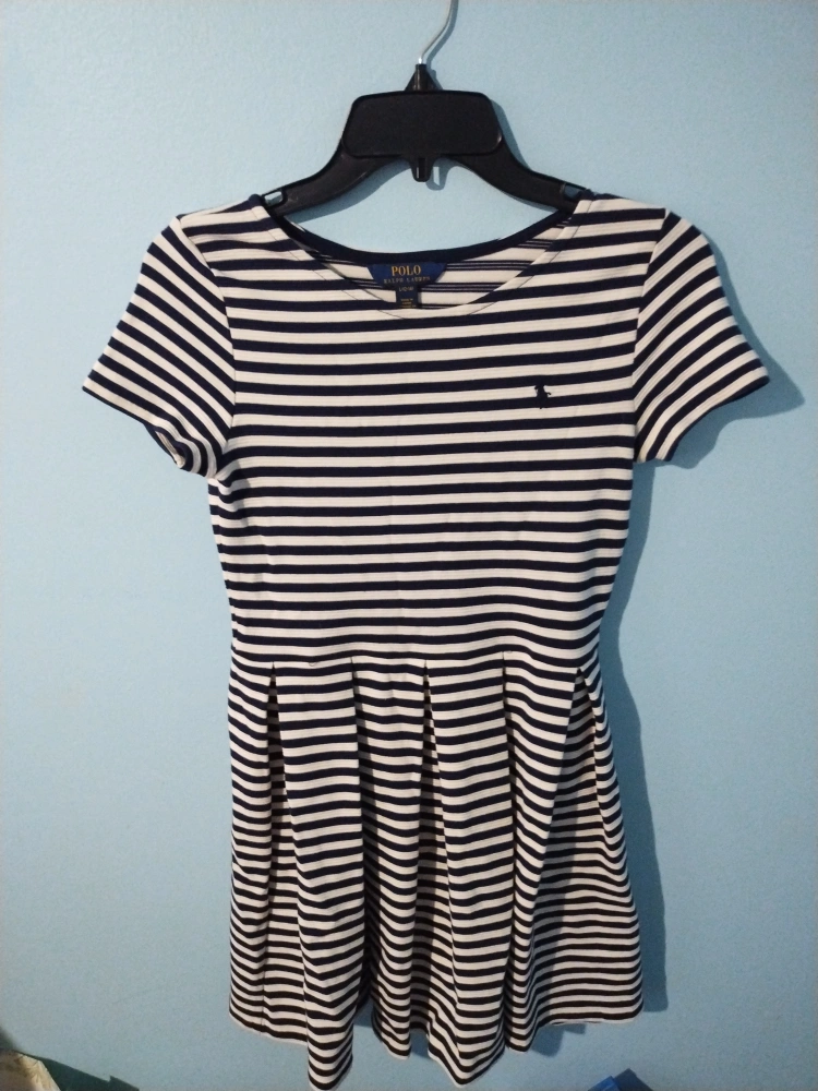 Here's a super cute Polo Ralph Lauren dress! It features a classic navy and white striped pattern and a flattering fit. The size is L (12-14). It's in great condition and ready for a new home
