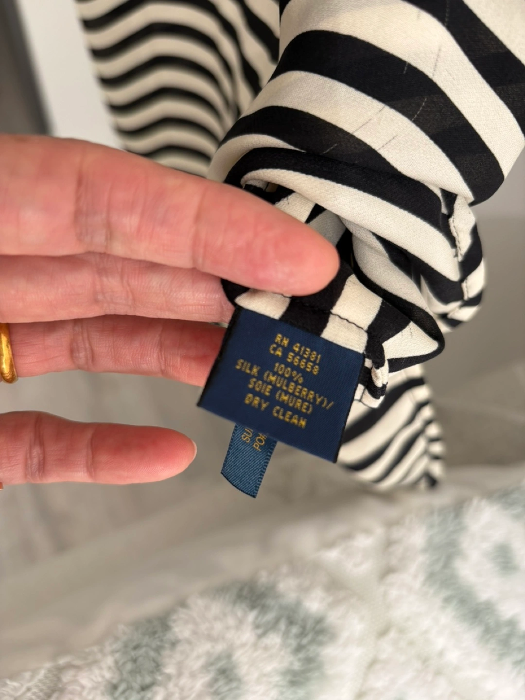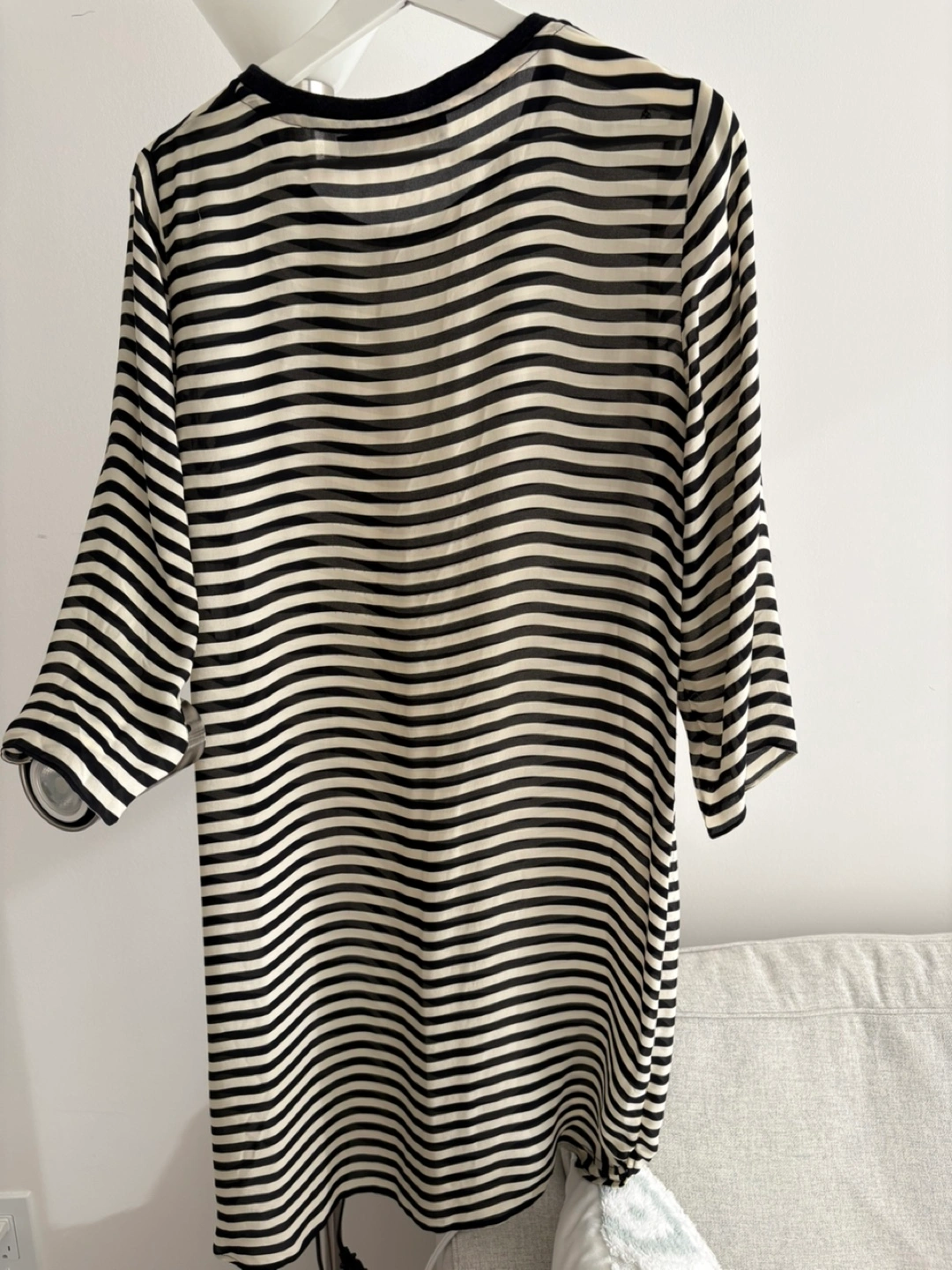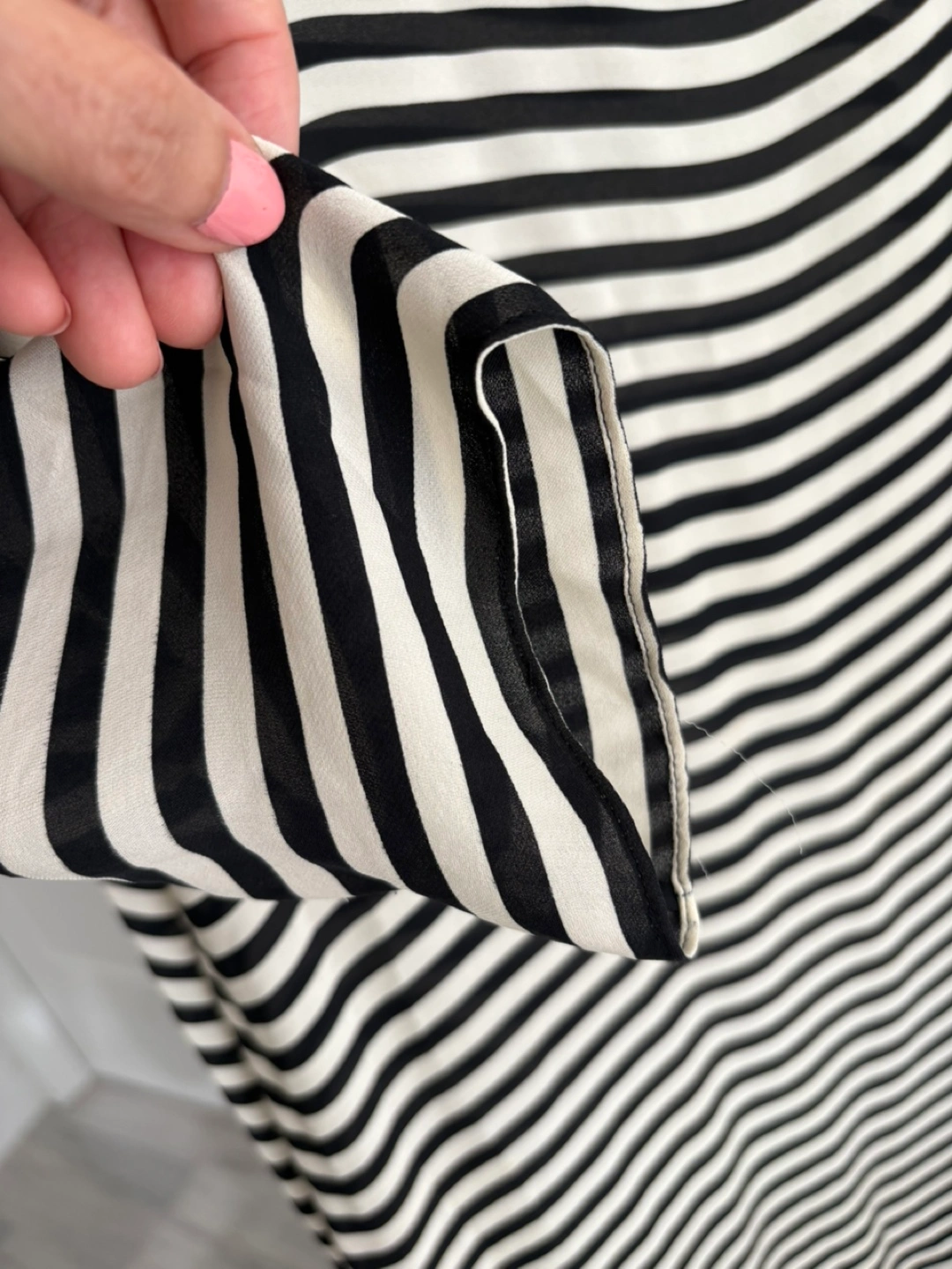 A beautiful blouse with a black and white striped pattern. A perfect addition to any wardrobe. This blouse would look great with any of your favorite outfits. Chiffon material