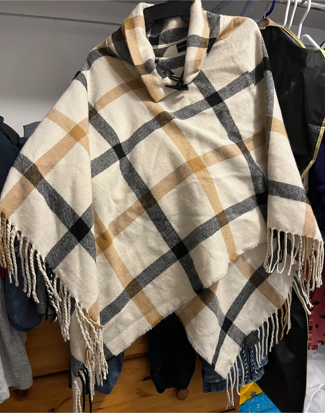 Cozy poncho featuring a stylish plaid pattern in cream, black, and tan colours. It has a toggle closure at the neck and fringe detailing along the hem. Perfect for layering on chilly days!