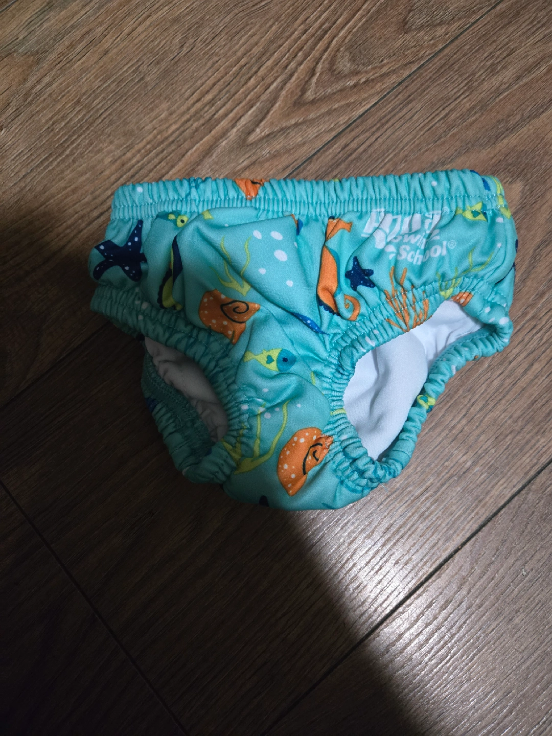 A cute swim diaper from Pool School! It's in great condition and ready for some fun in the water. Features a colourful sea creature design on a light blue background