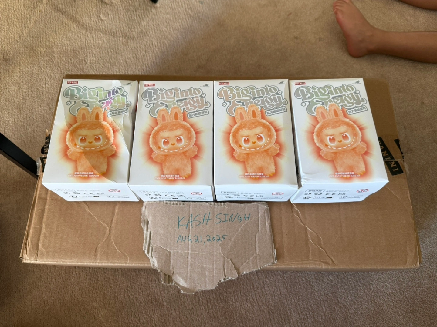 Lot of 4 Selling four Pop Mart Biginto Energy plush pendant blind boxes! They are from the "前方高能系列" series. Each box contains a vinyl plush pendant. They are still in their original packaging.
