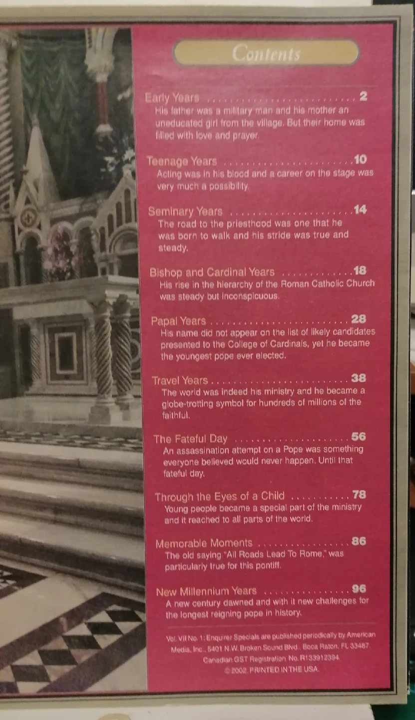 Selling a limited collector's 96-page edition magazine about Pope John Paul II. It's a celebration of his service to the world and includes never-before-seen photos from his childhood, time in the army, and as a parish priest. In excellent condition, like new. Pickup available from Etobicoke or Richmond Hill.