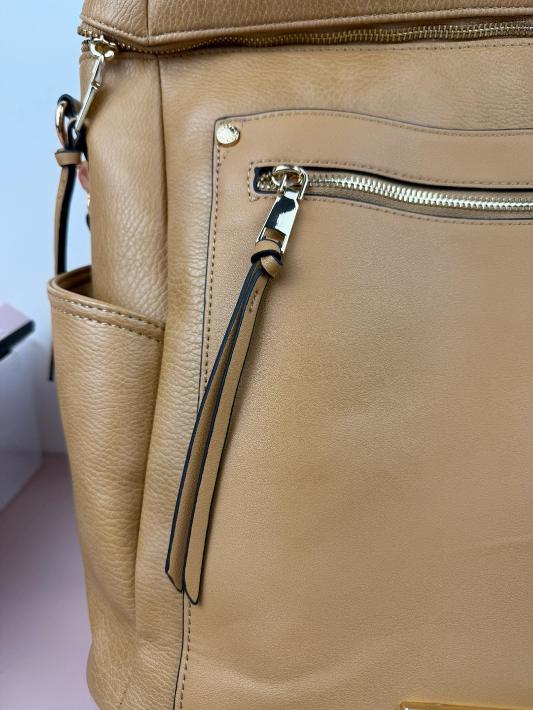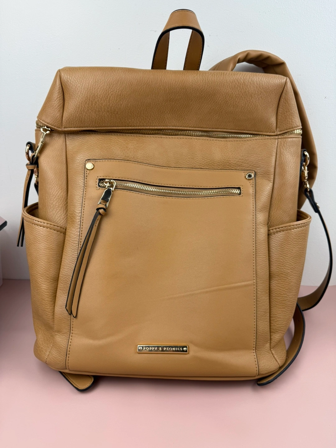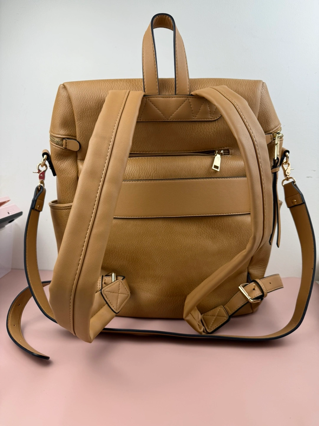 Gorgeous tan backpack. Multiple pockets and compartments. Adjustable straps. Great for everyday use. CROSSPOSTED -Versatile 2-in-1 -Interior cupholder fits a 30oz Stanley as well as your standard tumblers and water bottles -Wear it over your shoulder with the removable strap -Padded interior laptop compartment fits 16" laptop -Tons of storage featuring a front patch pocket with secure zipper pocket and two side water bottle pockets -Smart interior zipper pocket -Back Trolley Sleeve -Built-in cell phone and sunnies compartment -Interior key leash -Padded and adjustable shoulder straps -Crafted in soft pebbled vegan leather -Lining made from recycled plastic bottles -YKK Zippers -Signature light gold hardware -Dimensions: 14” L x 16.5” H x 5.5” W
