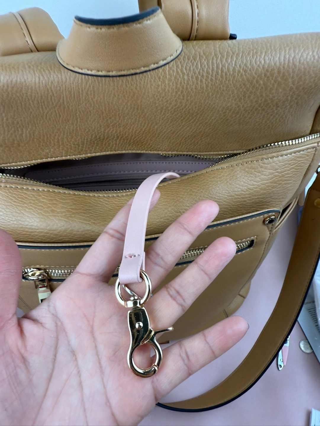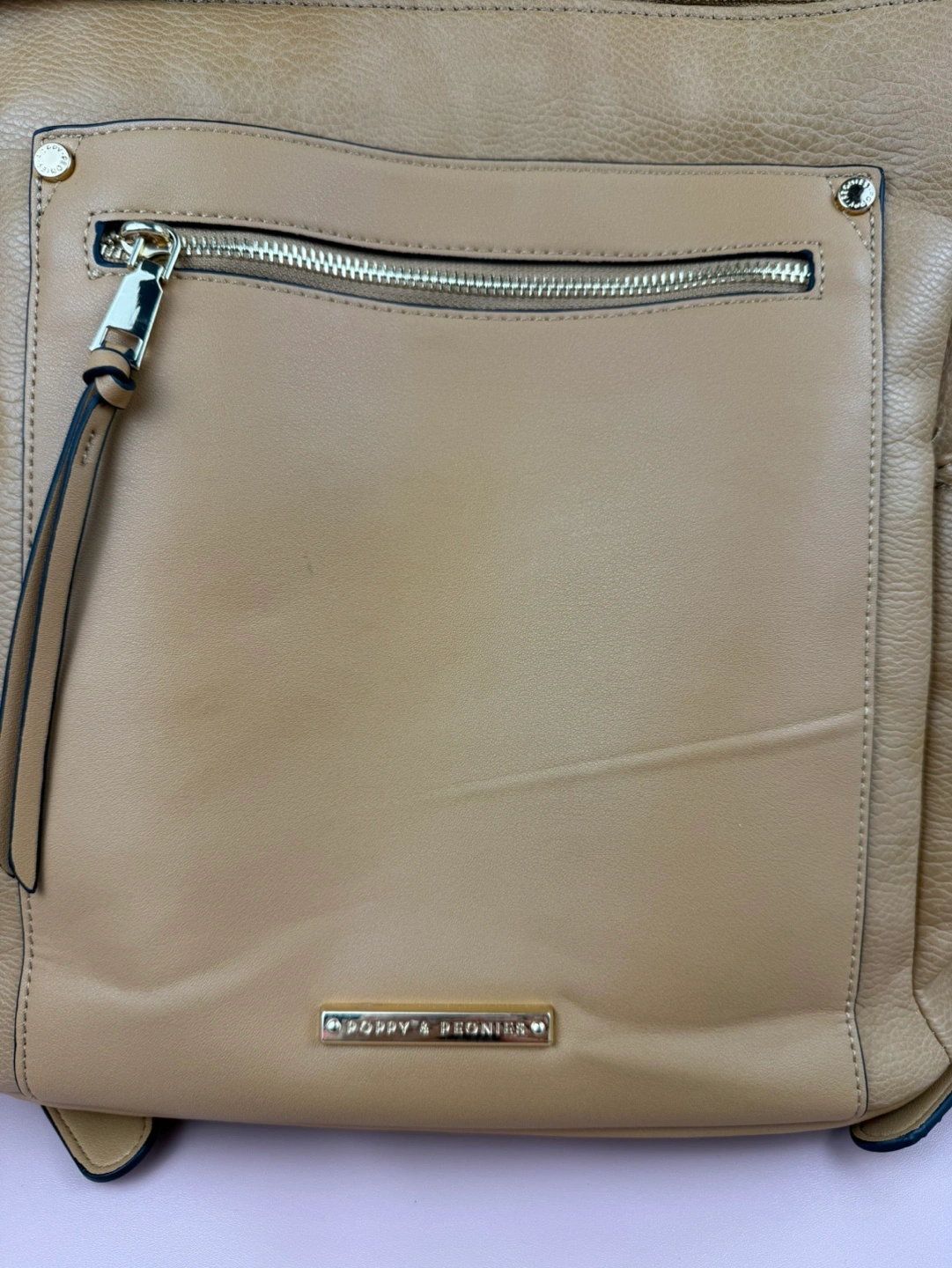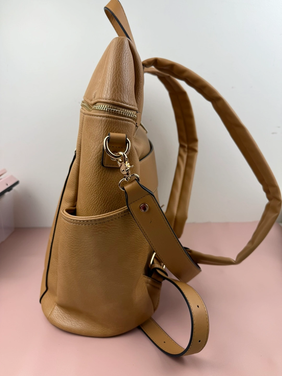 Gorgeous tan backpack. Multiple pockets and compartments. Adjustable straps. Great for everyday use. CROSSPOSTED -Versatile 2-in-1 -Interior cupholder fits a 30oz Stanley as well as your standard tumblers and water bottles -Wear it over your shoulder with the removable strap -Padded interior laptop compartment fits 16" laptop -Tons of storage featuring a front patch pocket with secure zipper pocket and two side water bottle pockets -Smart interior zipper pocket -Back Trolley Sleeve -Built-in cell phone and sunnies compartment -Interior key leash -Padded and adjustable shoulder straps -Crafted in soft pebbled vegan leather -Lining made from recycled plastic bottles -YKK Zippers -Signature light gold hardware -Dimensions: 14” L x 16.5” H x 5.5” W
