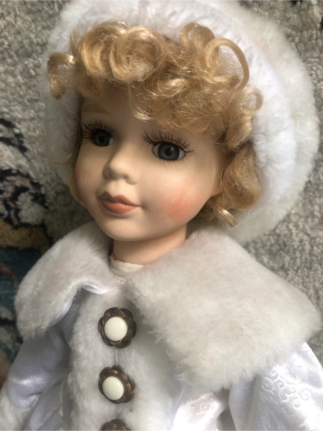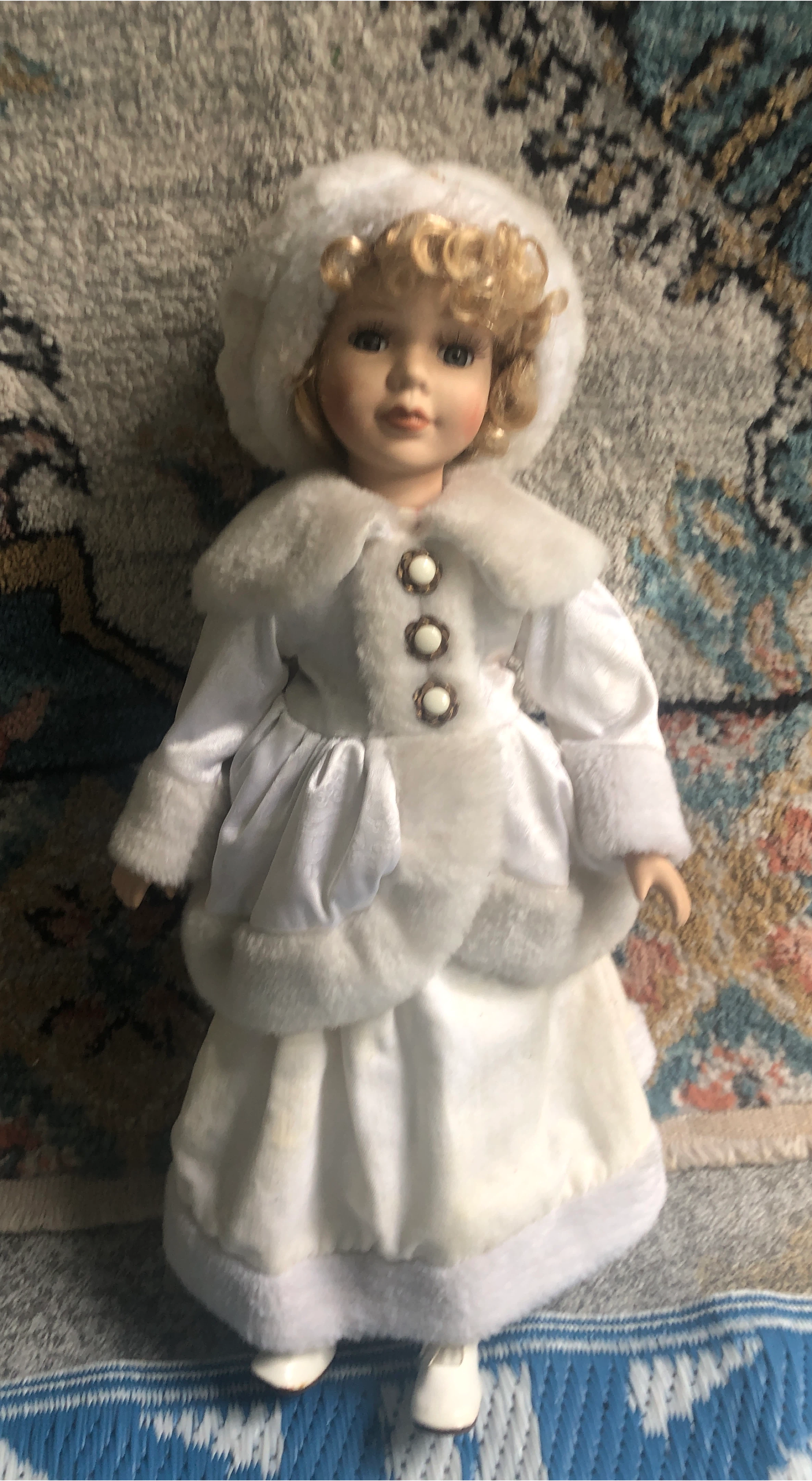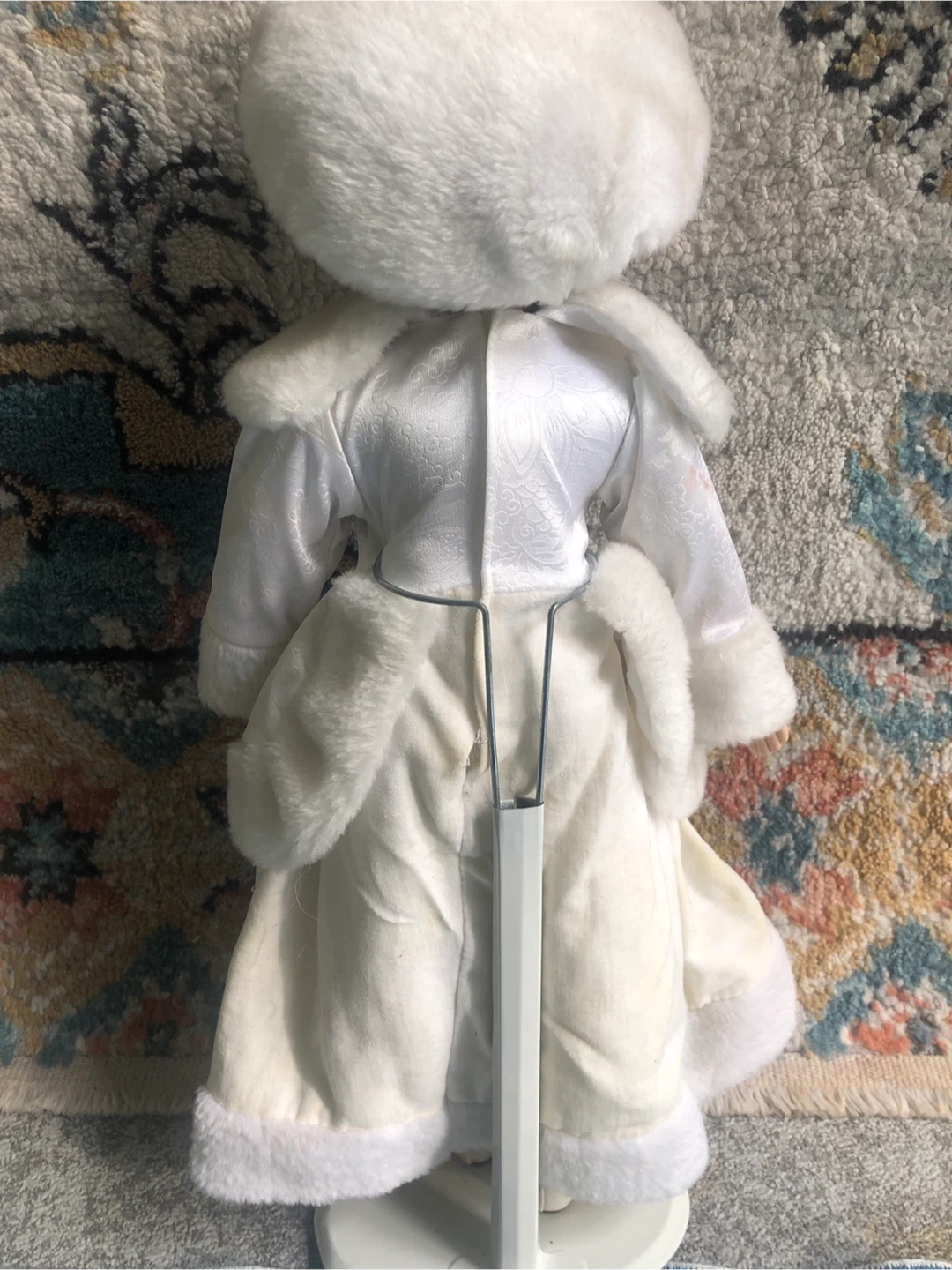 This is a beautiful porcelain doll dressed in a white winter outfit. It comes with a stand for display. It shows signs of wear, particularly on the shoes, but is otherwise in good condition. This doll would make a lovely addition to any collection