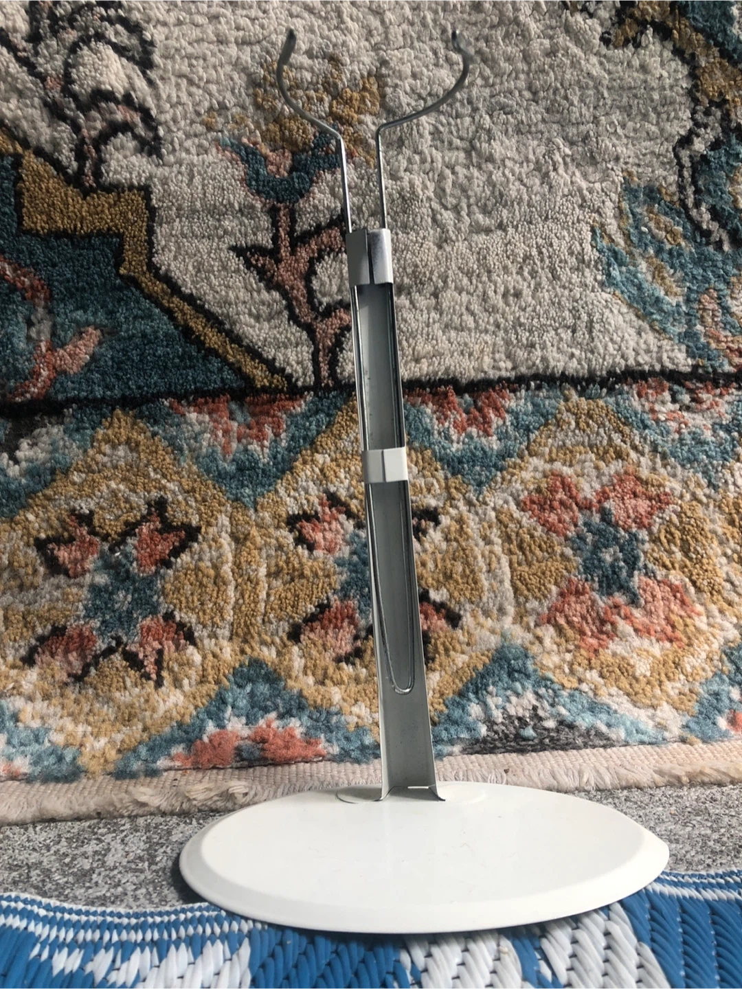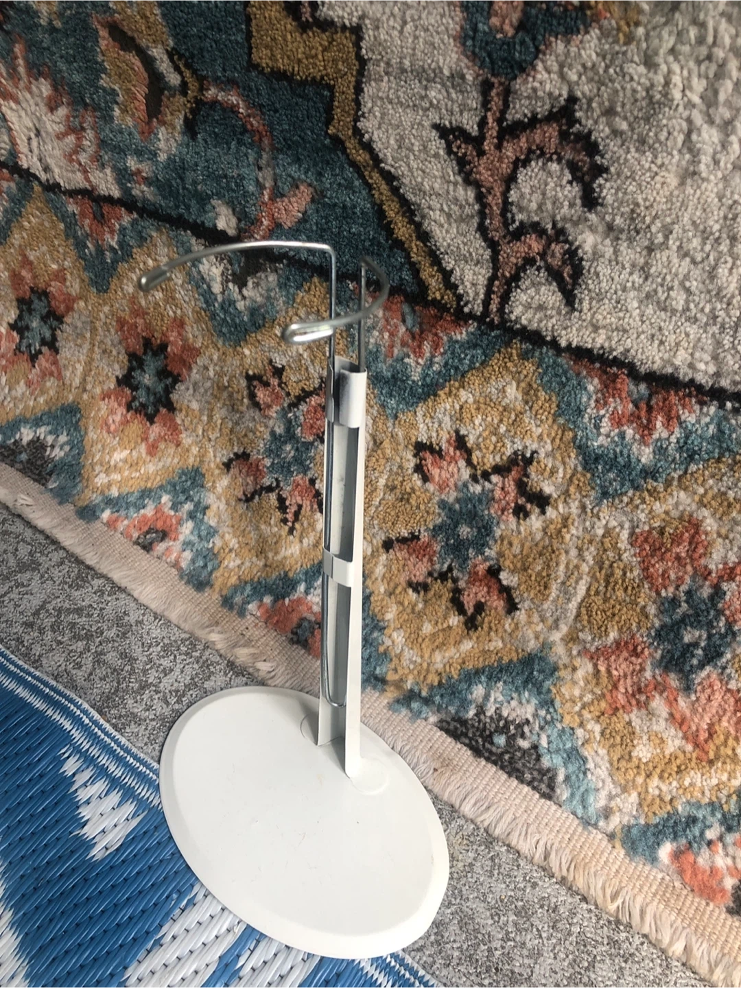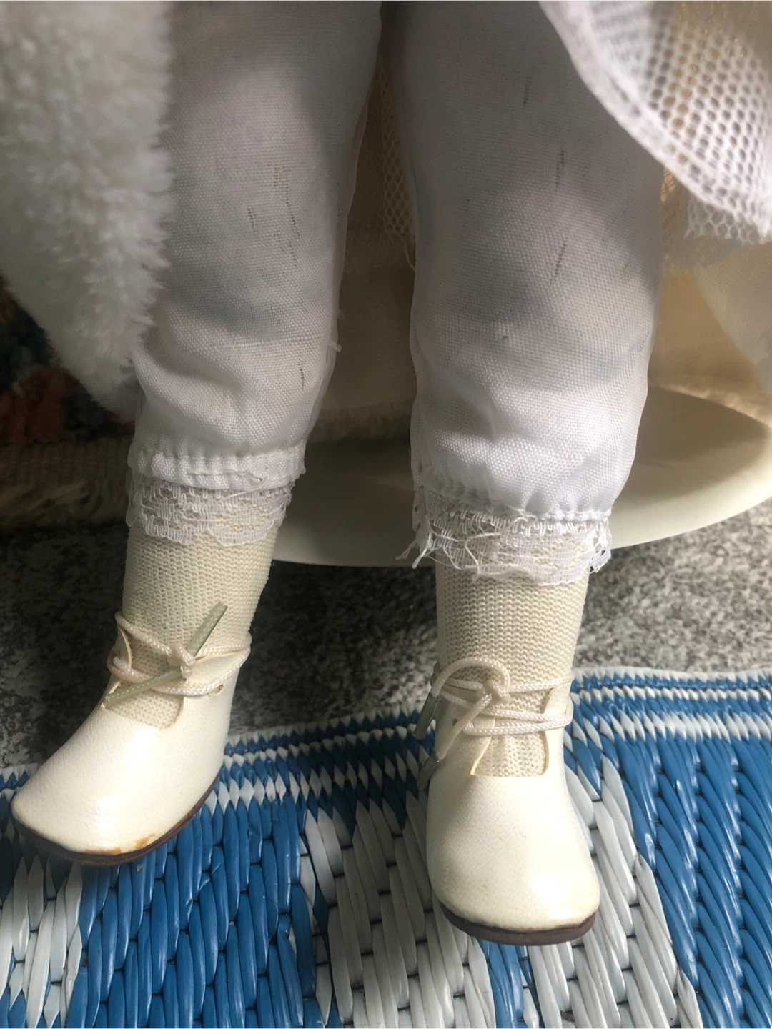 This is a beautiful porcelain doll dressed in a white winter outfit. It comes with a stand for display. It shows signs of wear, particularly on the shoes, but is otherwise in good condition. This doll would make a lovely addition to any collection