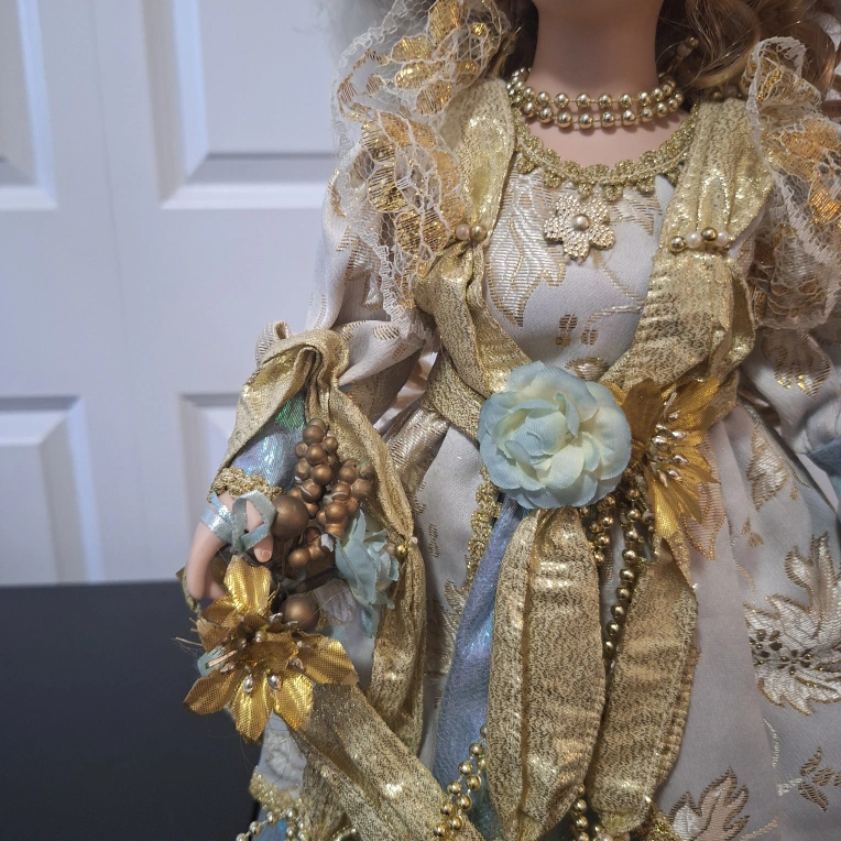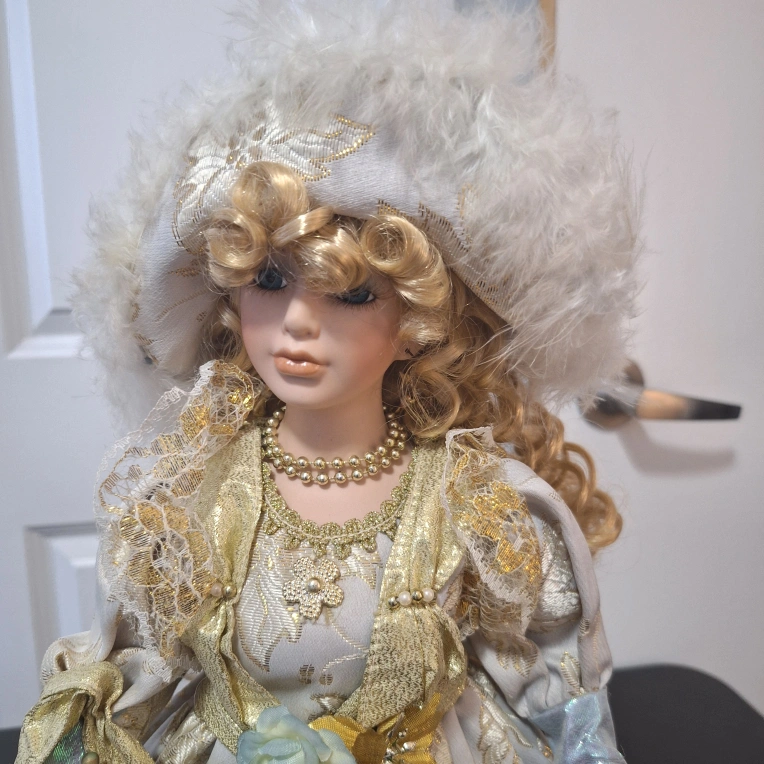 Selling a beautiful porcelain doll. It has a very fancy dress with gold trim and embellishments. It comes with a stand so you can display it nicely