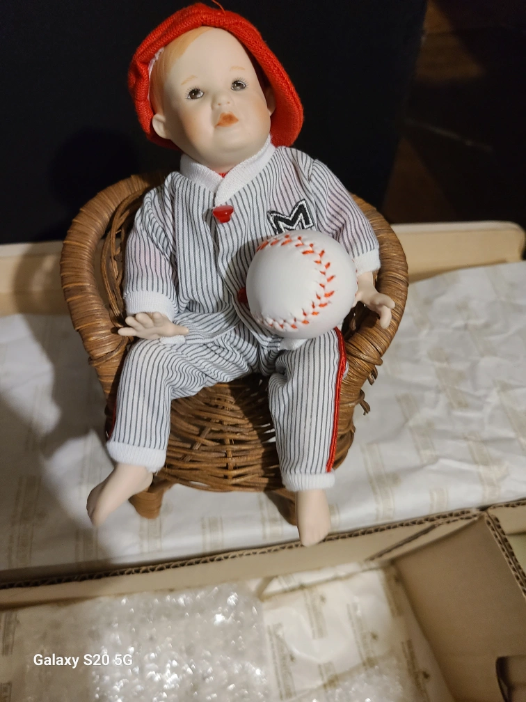 A cute porcelain doll sitting in a wicker chair! The doll is wearing a striped outfit with a red hat. It looks like it's in great condition and comes with a baseball accessory