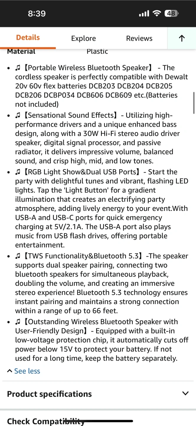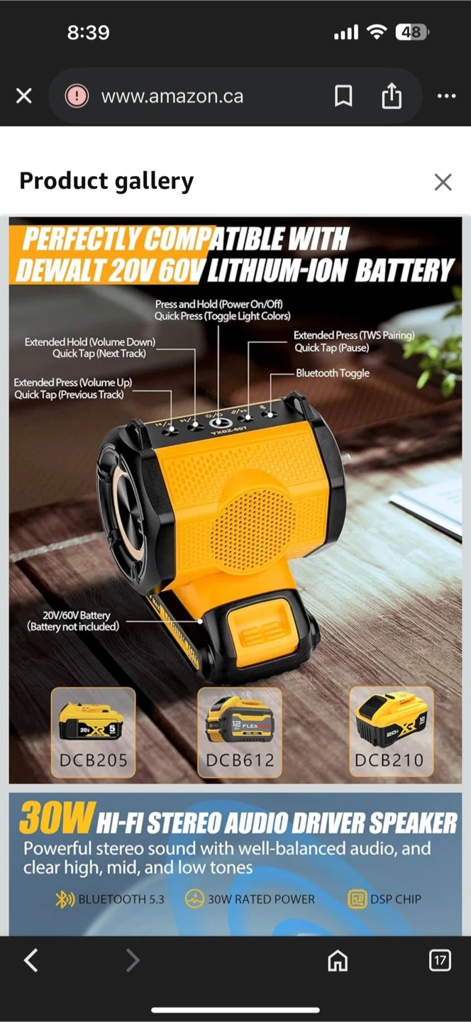 Portable Bluetooth Speaker for Dewalt 20v 60v Battery