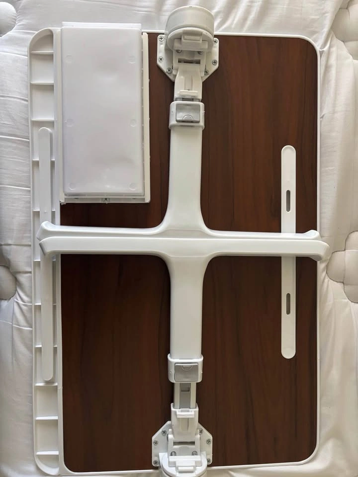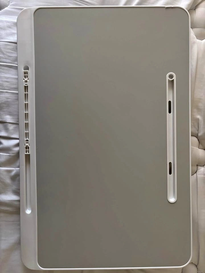 A portable laptop desk, also known as a lap desk or bed tray table, small, lightweight table with foldable legs. — A slot to hold a phone or tablet upright. — Foldable legs for easy storage. — Adjustable height and angle settings for ergonomic comfort. — A non-slip surface or a raised edge to keep devices from sliding off.
