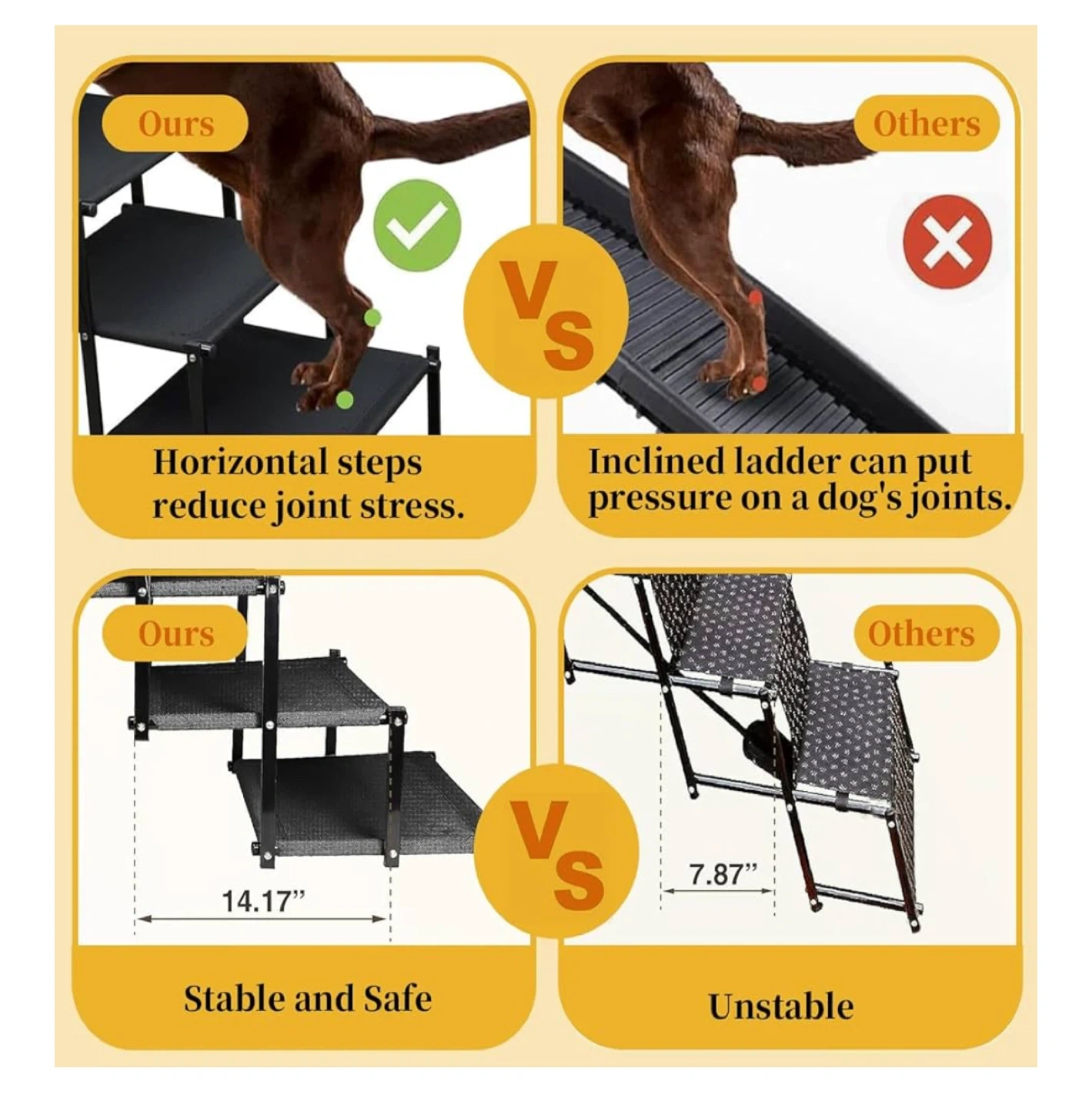 These portable folding dog stairs are perfect for helping your furry friend get in and out of the car! The stairs feature extra-wide steps for your dog's comfort and horizontal steps to reduce joint stress. They are stable and safe, with a non-slip fabric. The stairs also have a soft foam handle to prevent scratching your car's paint and a safety buckle to prevent shaking. Dimensions: - Step width: 14 inches - Step depth: 16.7 inches - Folded dimensions: 18.5 x 15.3 x 4.3 inches