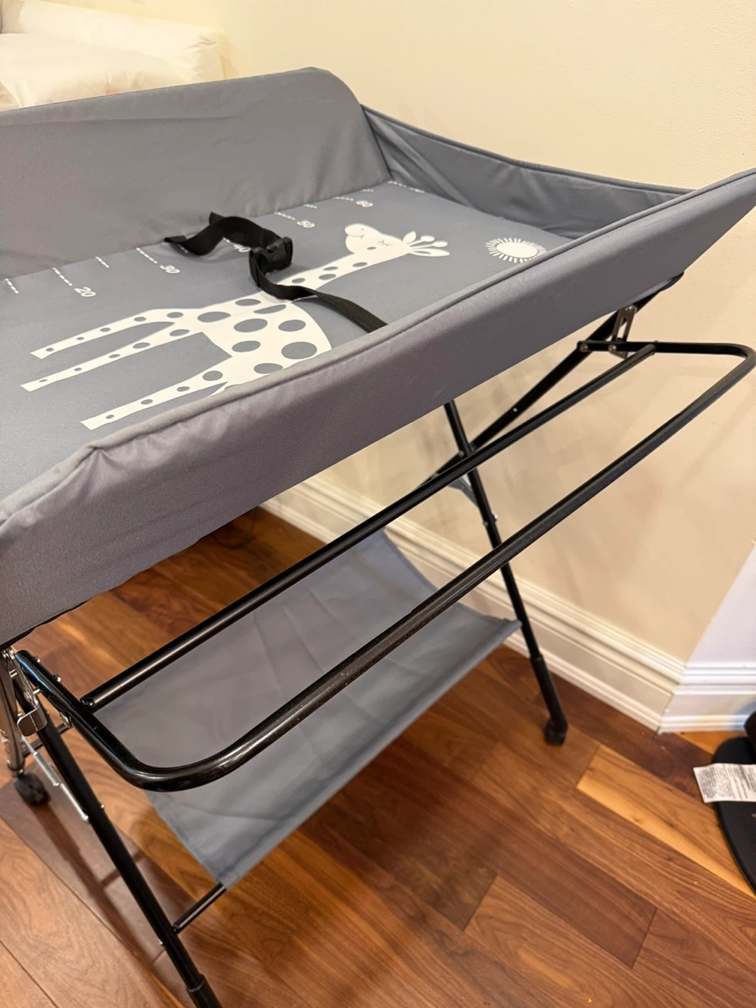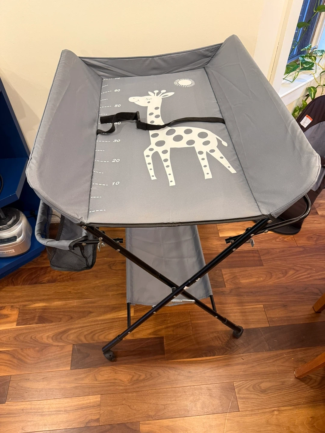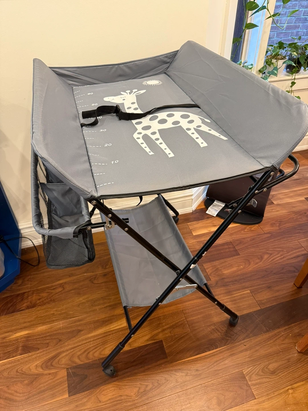 Selling a gently used folding baby changing table. It's in great shape and super convenient for small spaces. The table is grey with a cute giraffe design on the changing pad. It also has a storage basket underneath for diapers and wipes!