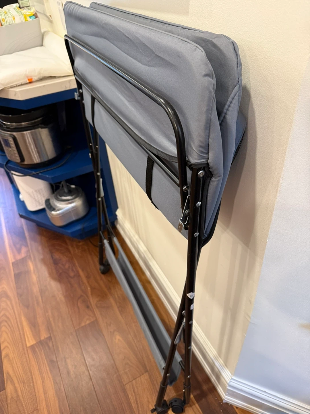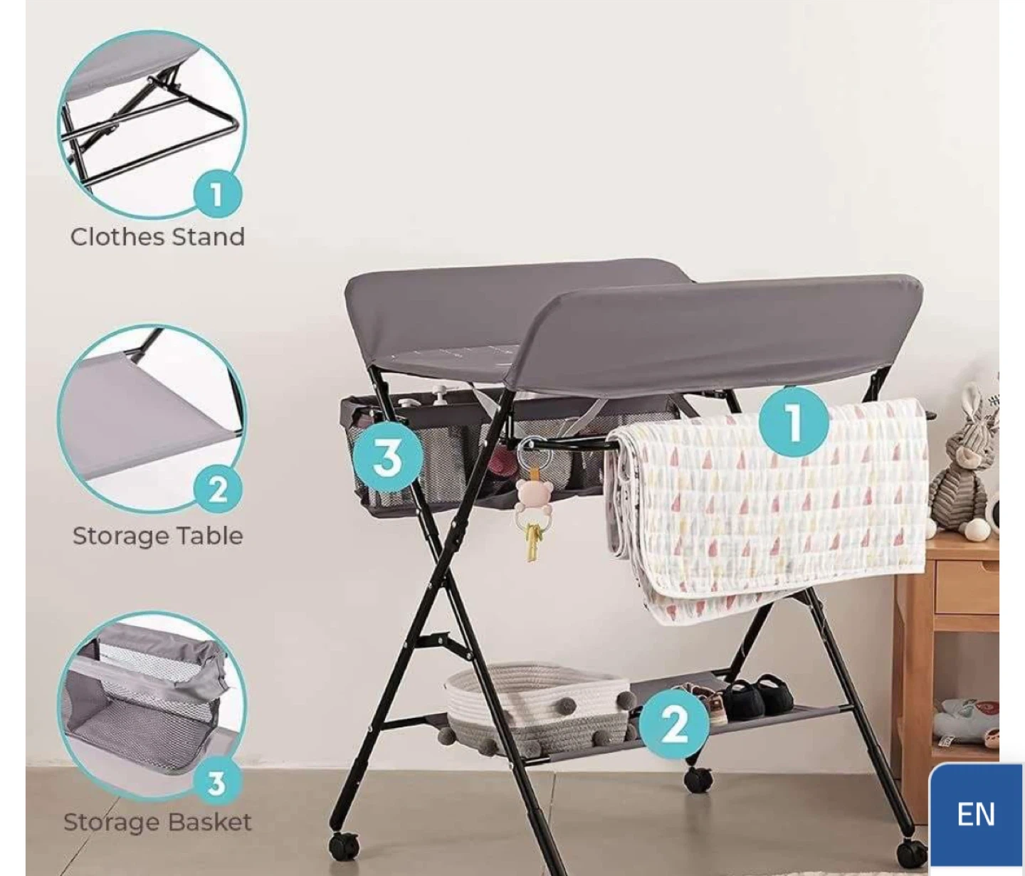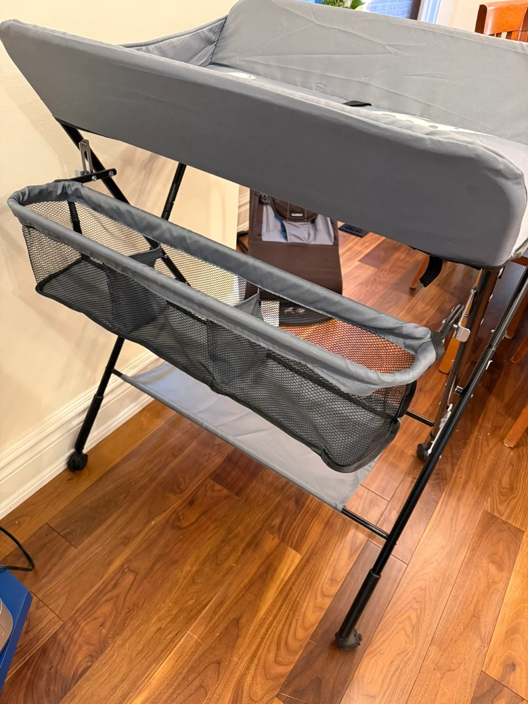 Selling a gently used folding baby changing table. It's in great shape and super convenient for small spaces. The table is grey with a cute giraffe design on the changing pad. It also has a storage basket underneath for diapers and wipes!