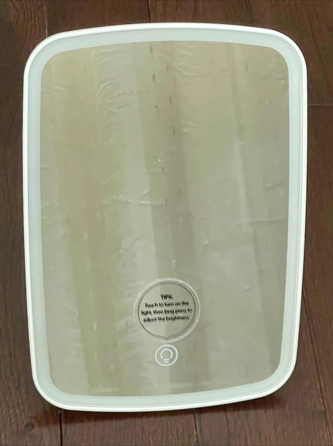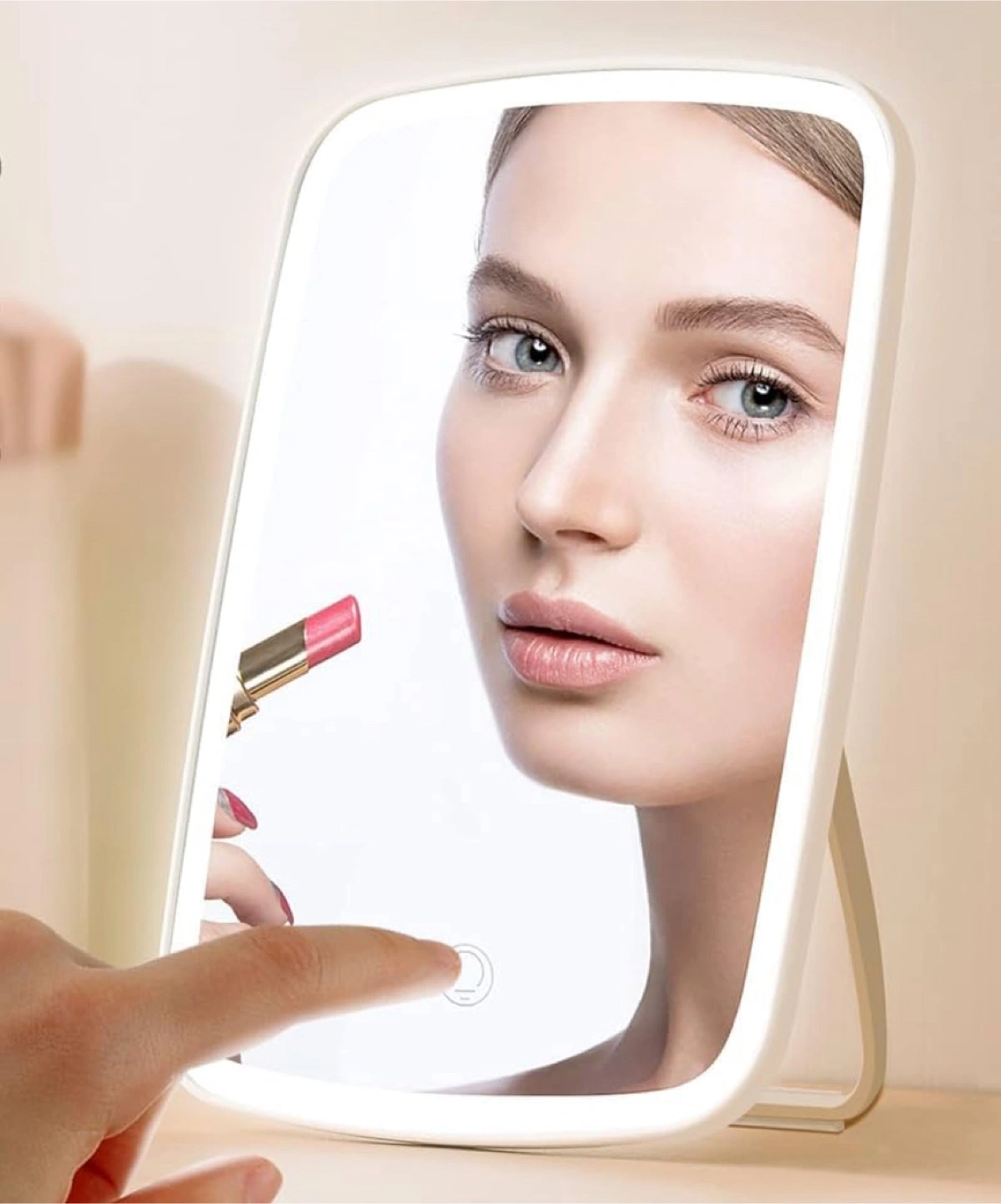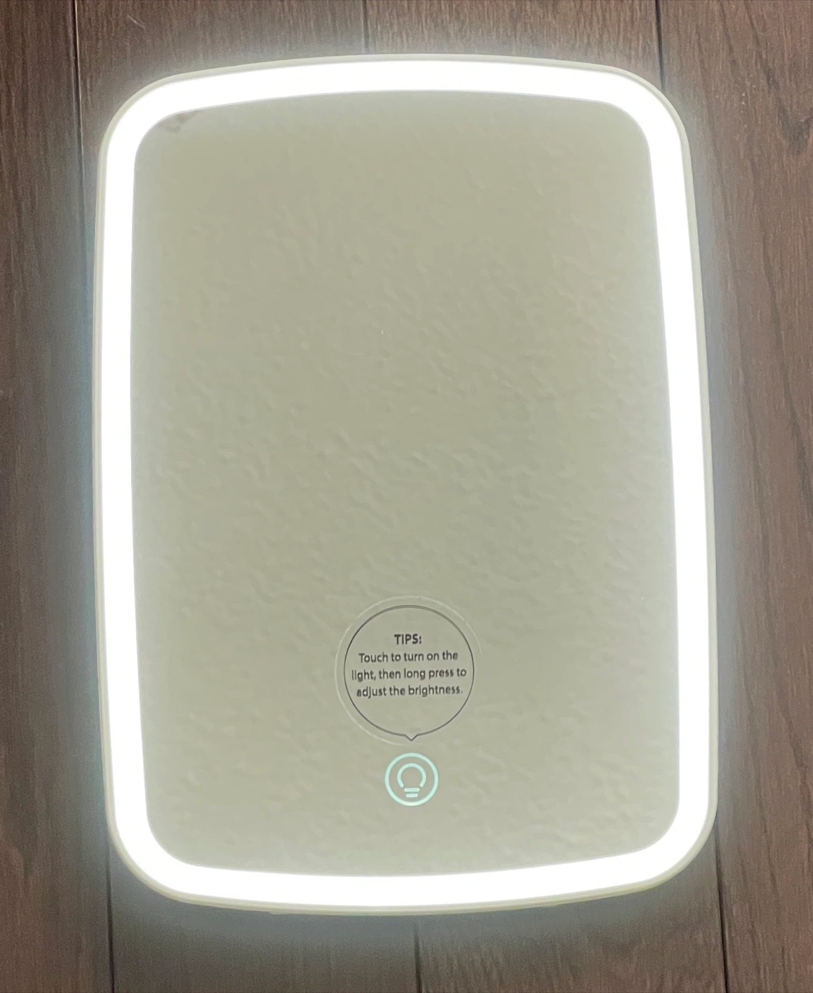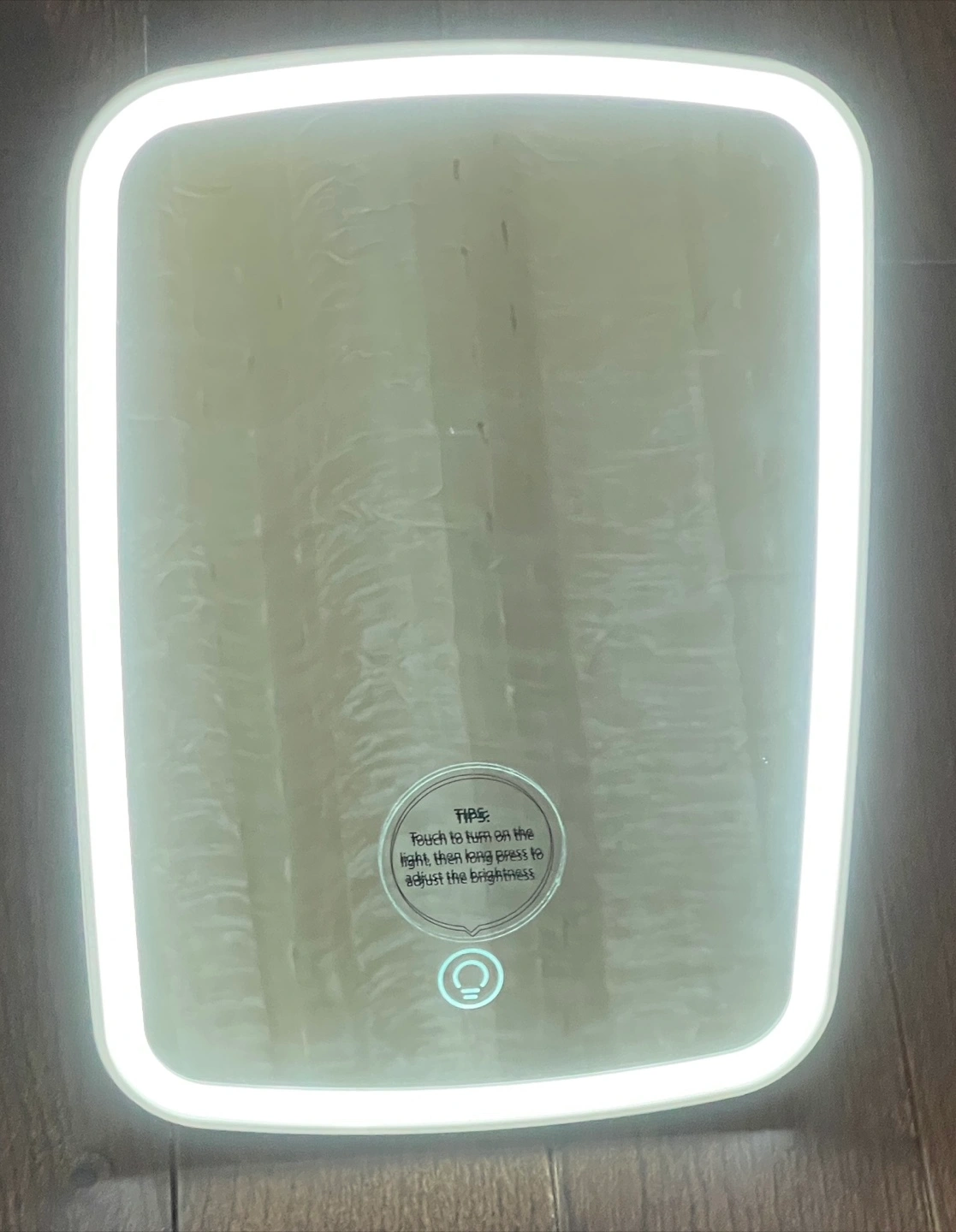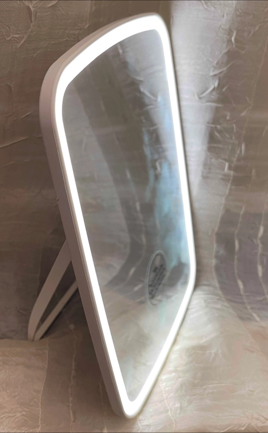 PORTABLE LED MAKEUP MIRROR - LED LIGHTED - USB RECHARGEABLE - TOUCH SCREEN LED LIGHTS - 100 DEGREES OF ADJUSTABLE BASE LEG - PORTABLE TRAVELING VANITY MIRROR - SLEEK AND STYLISH DESIGN - WIDTH: 6.6", LENGTH: 9.4", DIAGONAL: 10.2"