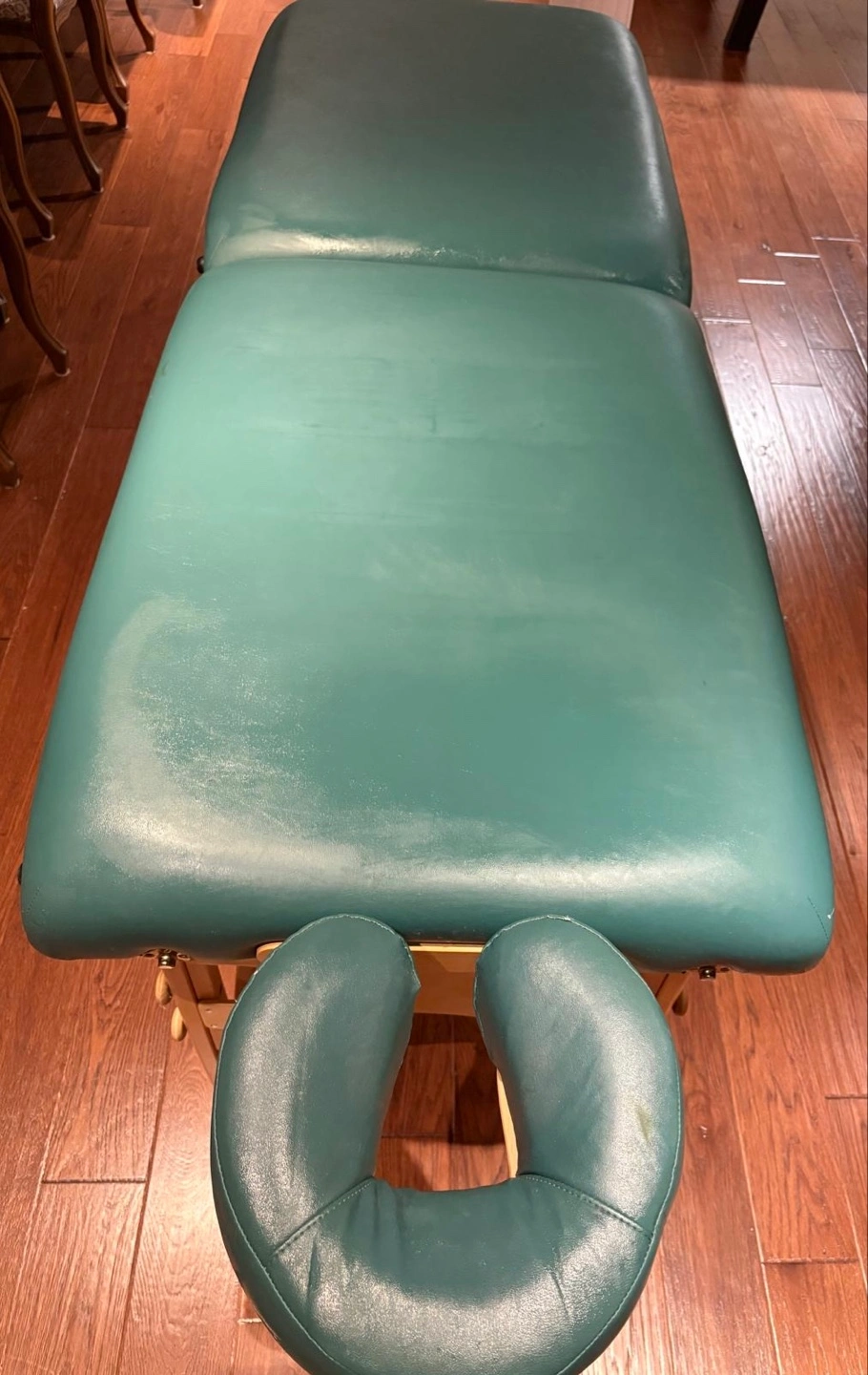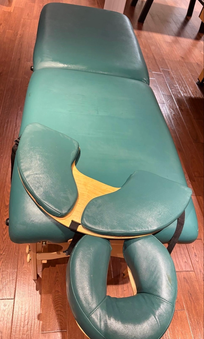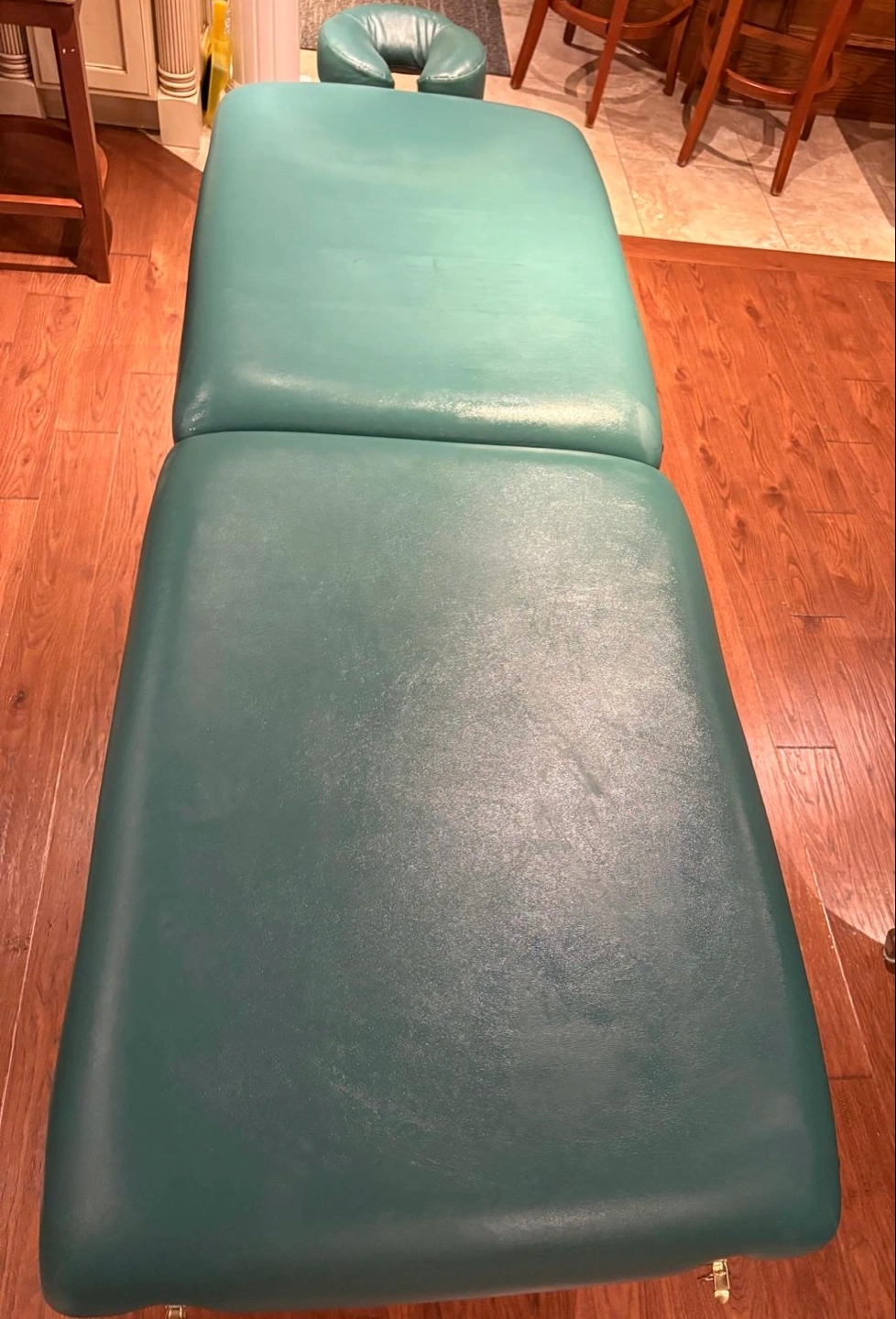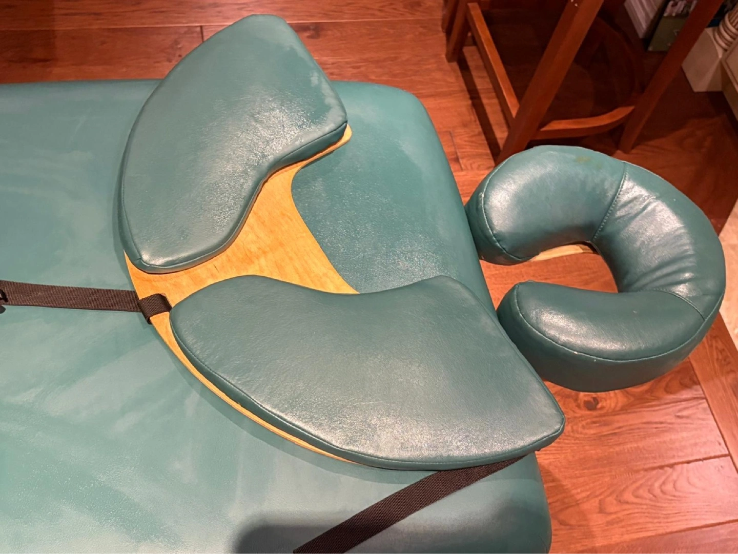 Selling a massage table in good condition. The table is green and comes with a headrest and armrests. It's perfect for anyone looking to set up a home massage studio or for professional use.