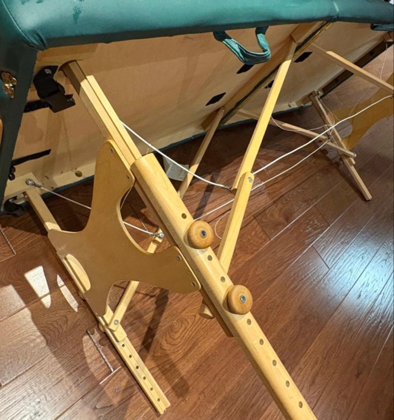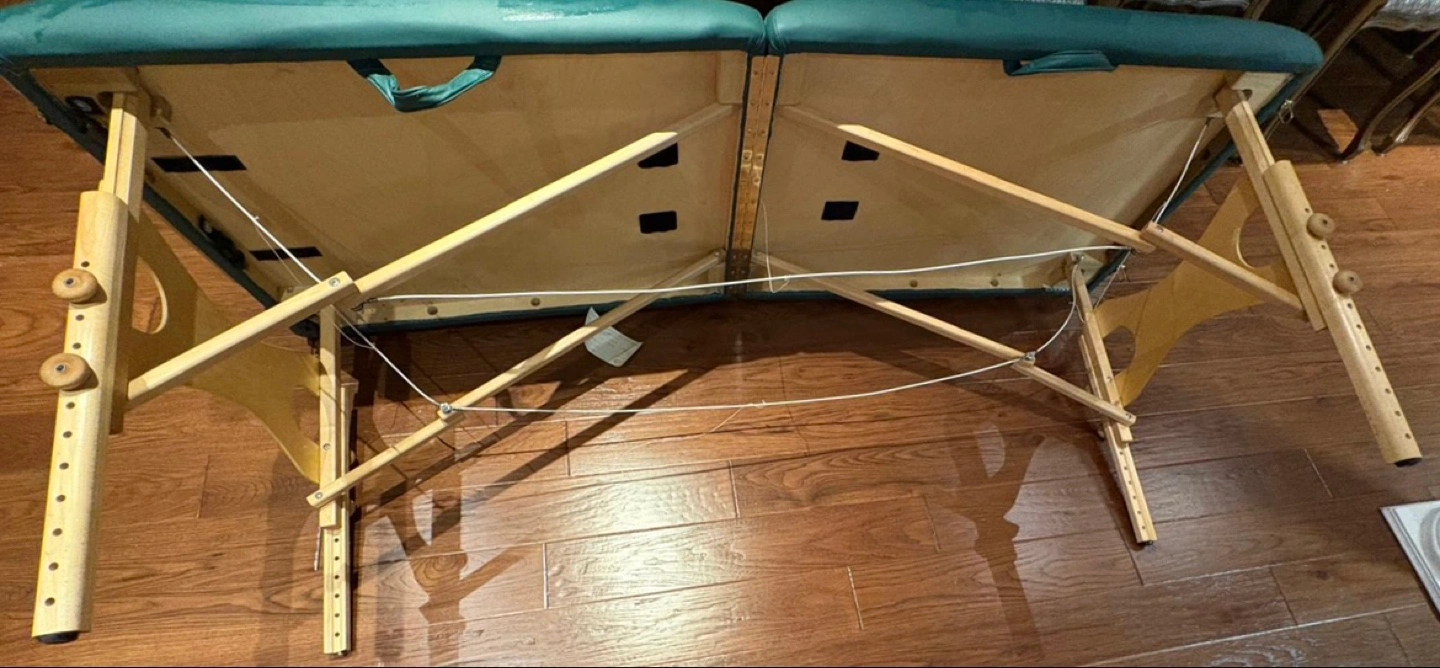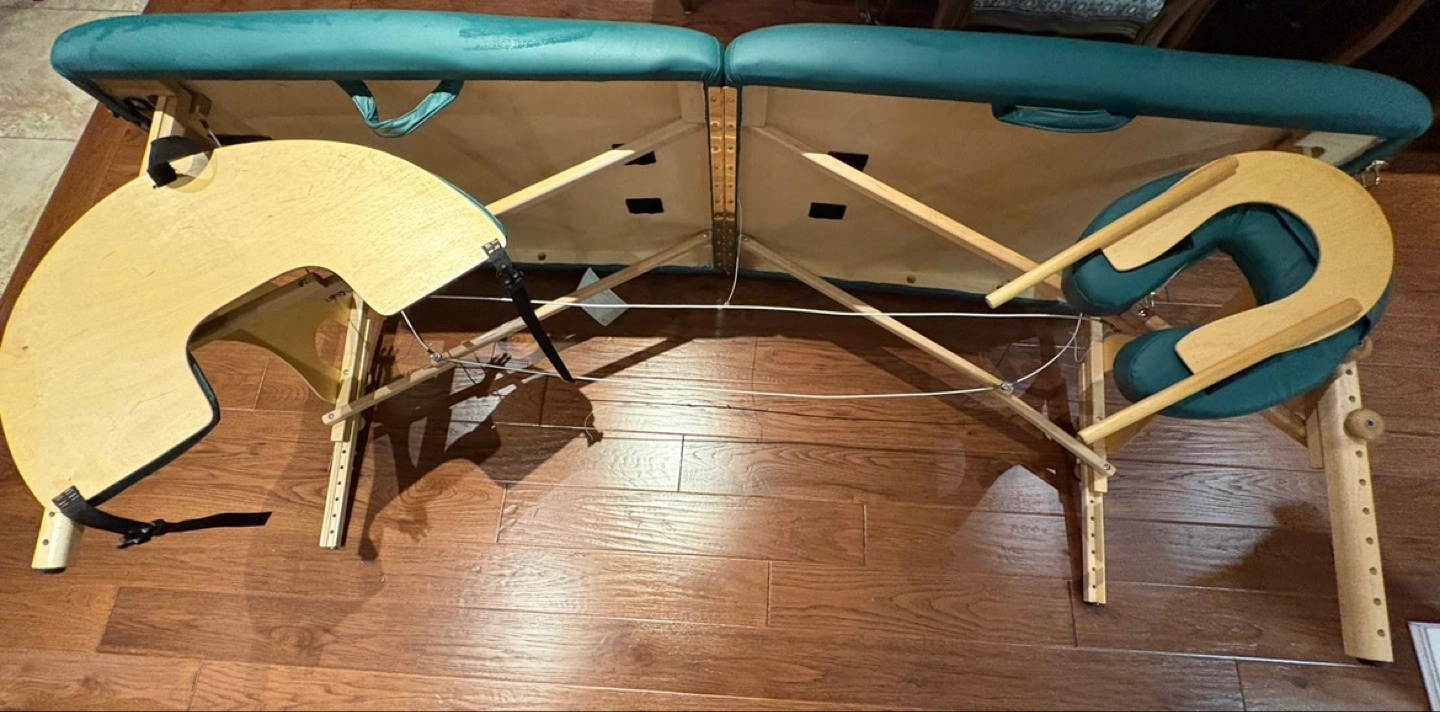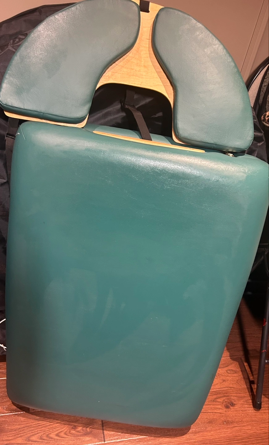 Selling a massage table in good condition. The table is green and comes with a headrest and armrests. It's perfect for anyone looking to set up a home massage studio or for professional use.